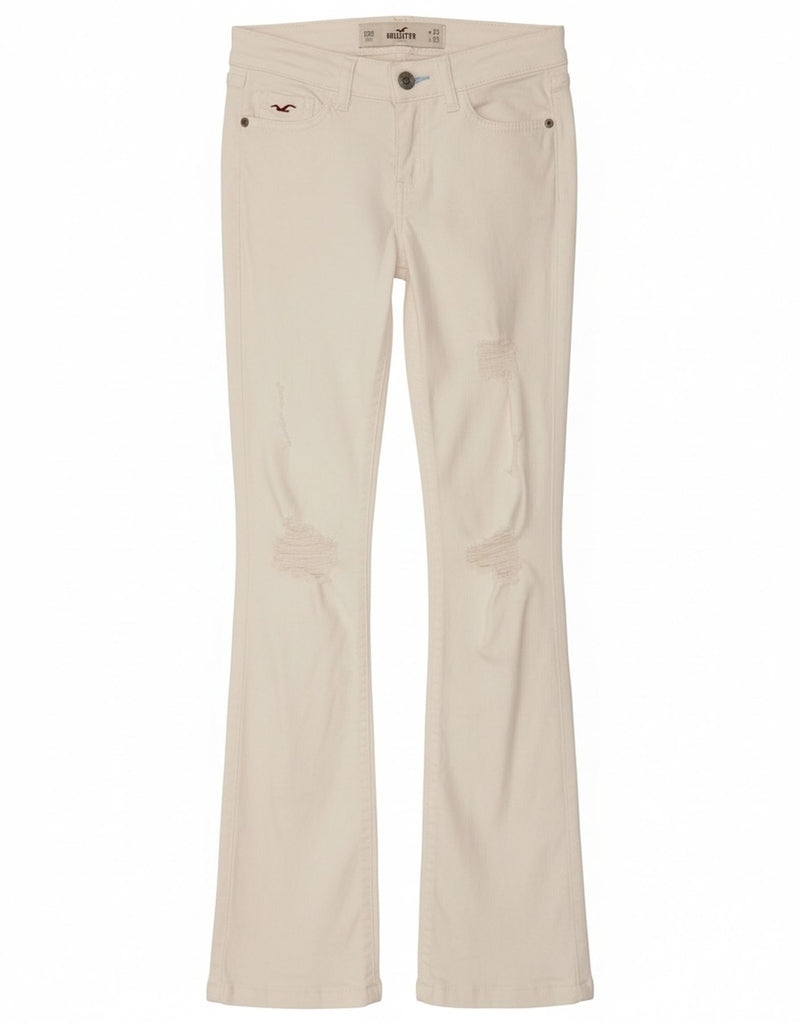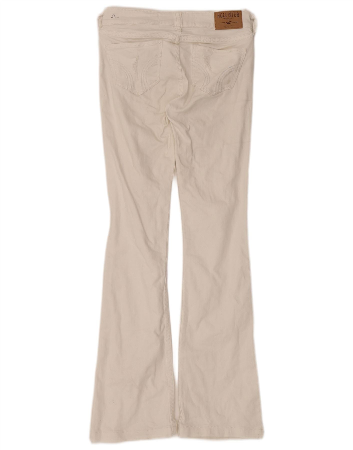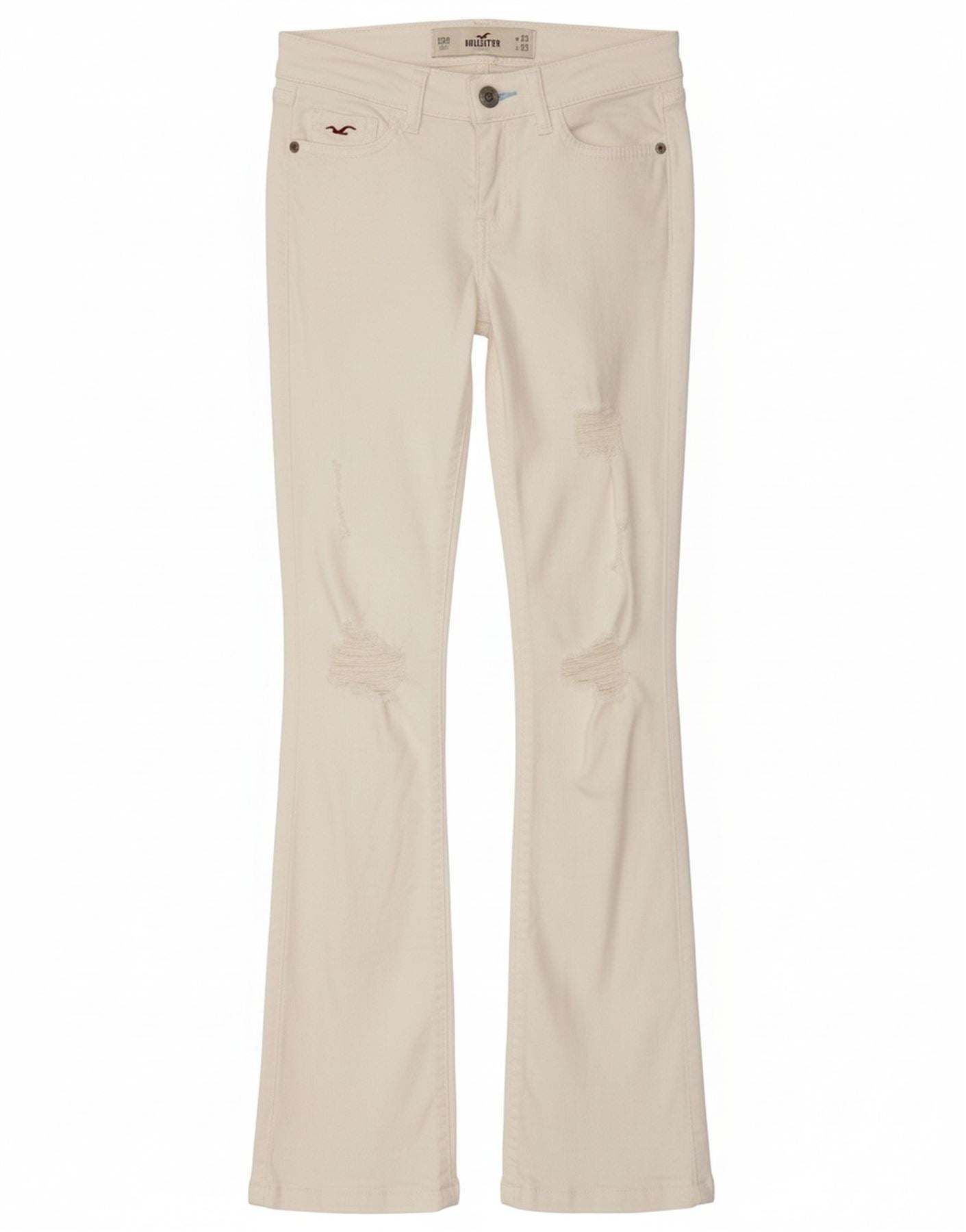 - AI Description: This Hollister womens flared jeans are crafted from off white distressed denim. They feature a mid rise waist and a button closure for a secure fit. The slim fit through the leg flares gently towards the ankle. Practical pockets add functionality. A subtle logo accent provides a classic branded touch. The stretch denim ensures comfort and ease of movement.