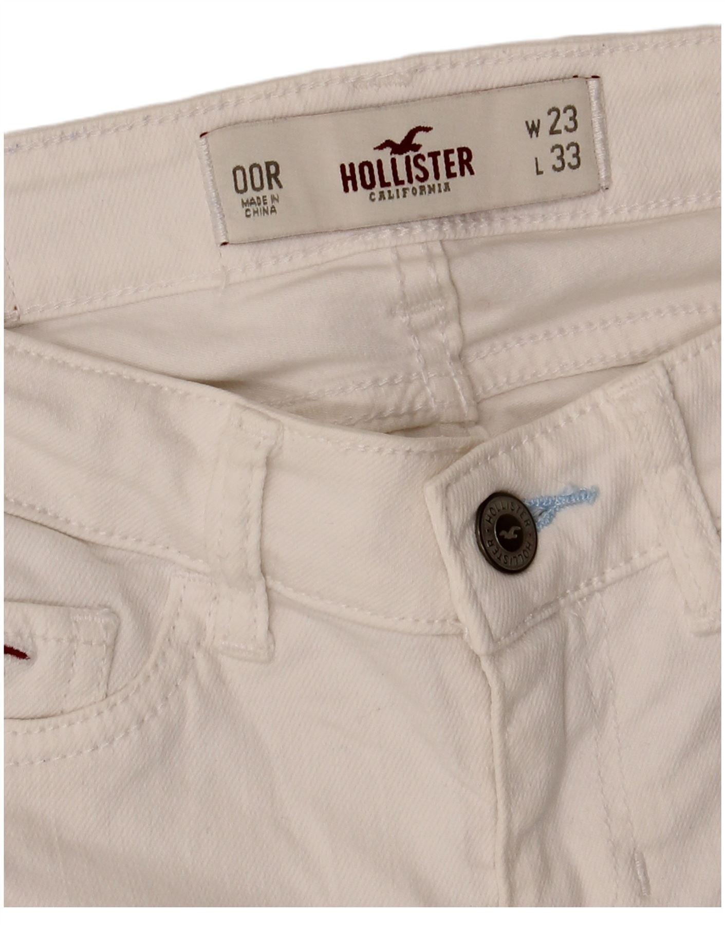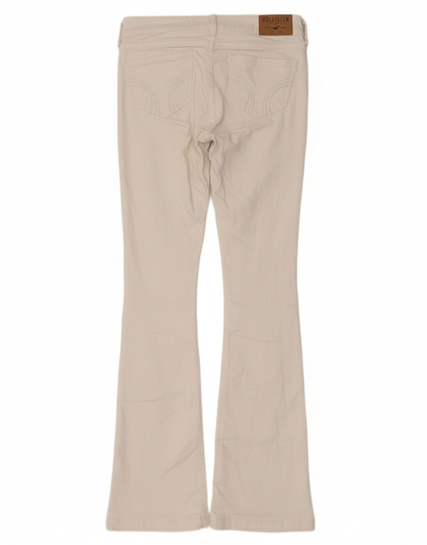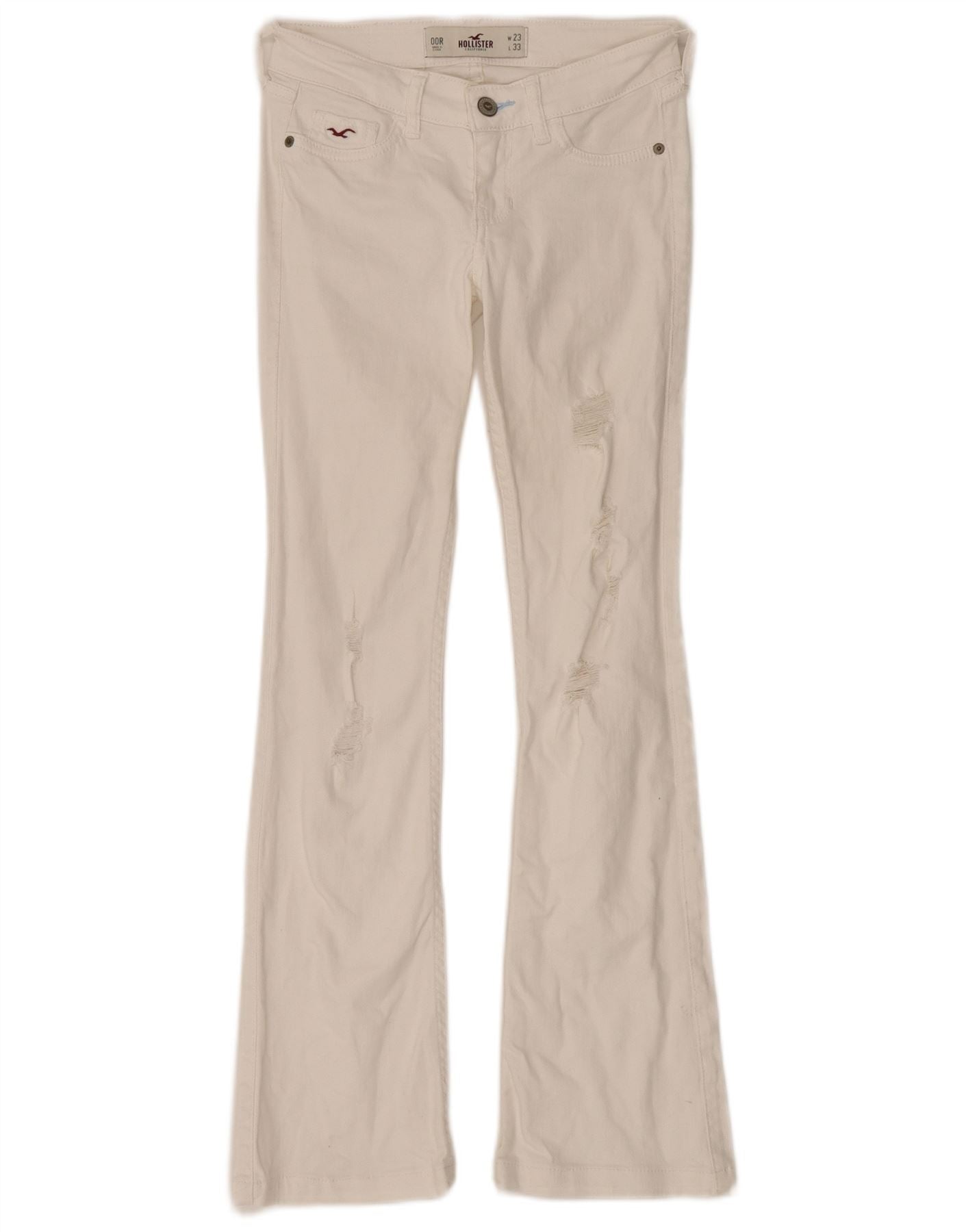 - AI Description: This Hollister womens flared jeans are crafted from off white distressed denim. They feature a mid rise waist and a button closure for a secure fit. The slim fit through the leg flares gently towards the ankle. Practical pockets add functionality. A subtle logo accent provides a classic branded touch. The stretch denim ensures comfort and ease of movement.