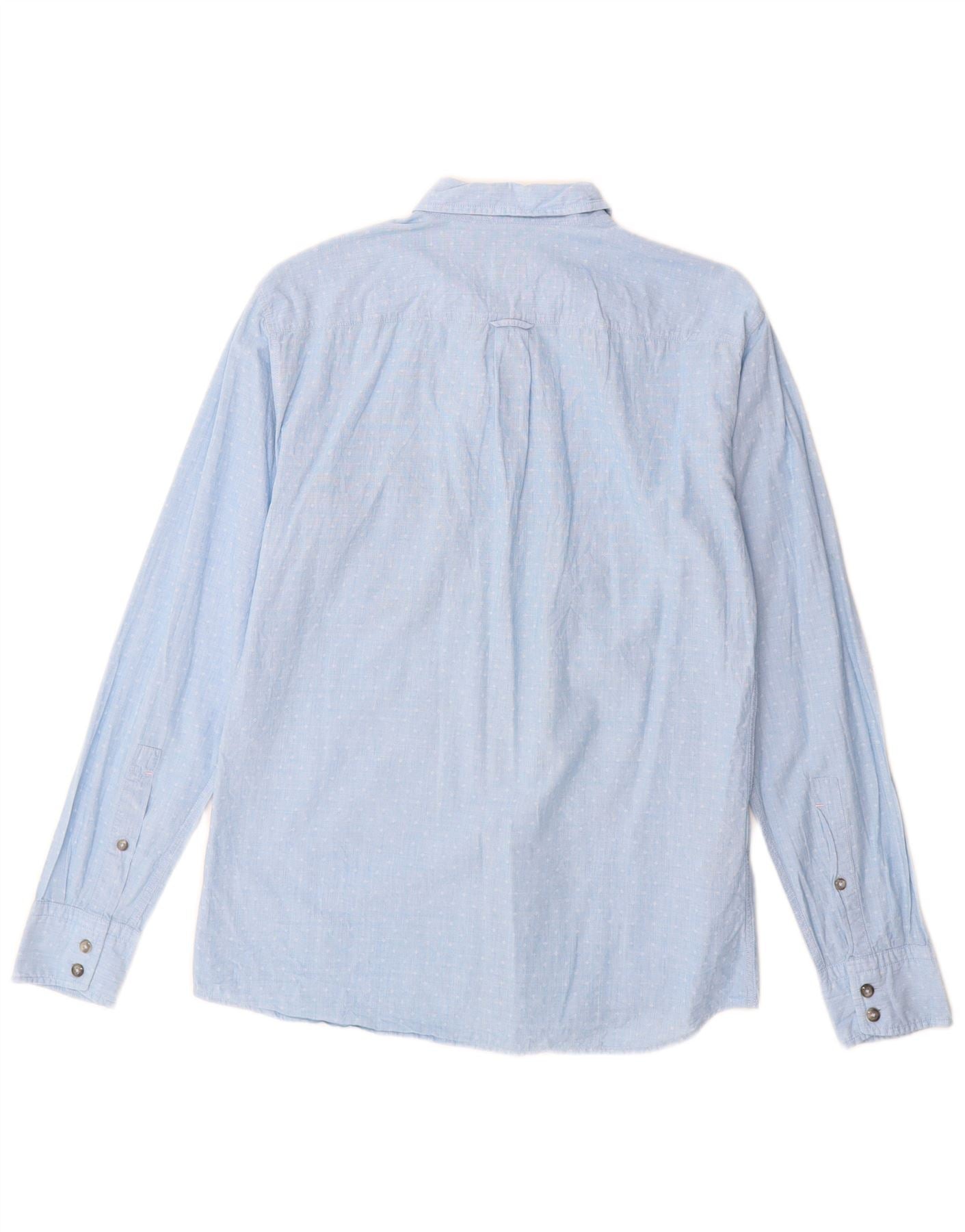- Descrizione dell'IA: Questa camicia da uomo Hugo Boss è realizzata in tessuto azzurro, caratterizzato da un sottile motivo maculato. Ha uno scollo classico con colletto e maniche lunghe con polsini con bottoni. L'abbottonatura frontale garantisce una chiusura ordinata. Una singola tasca sul petto aggiunge dettagli pratici. La sua vestibilità regolare offre una vestibilità comoda, rendendolo una scelta versatile per un look casual elegante.