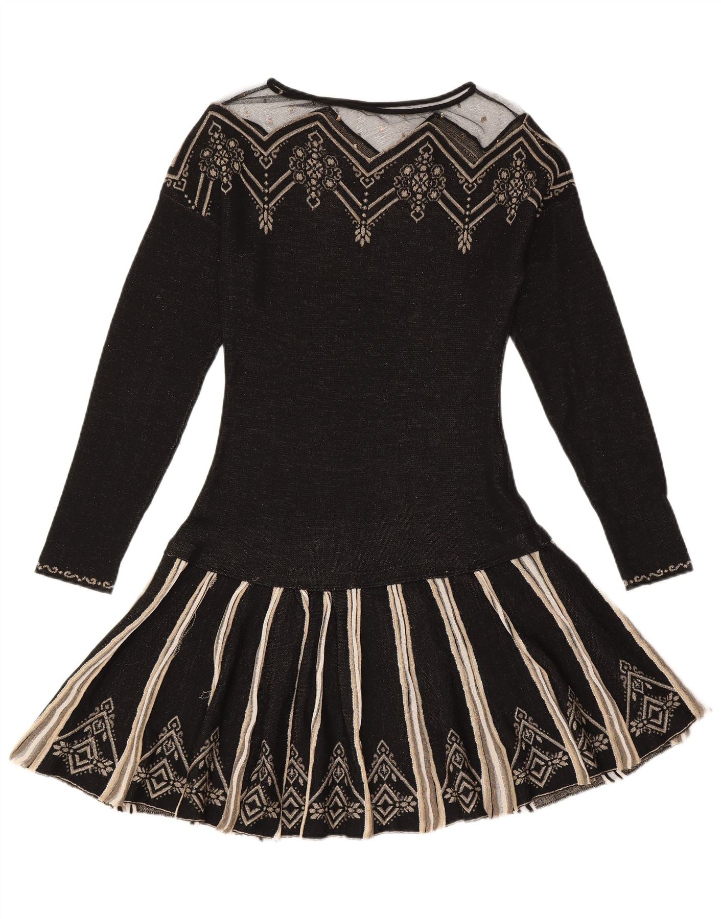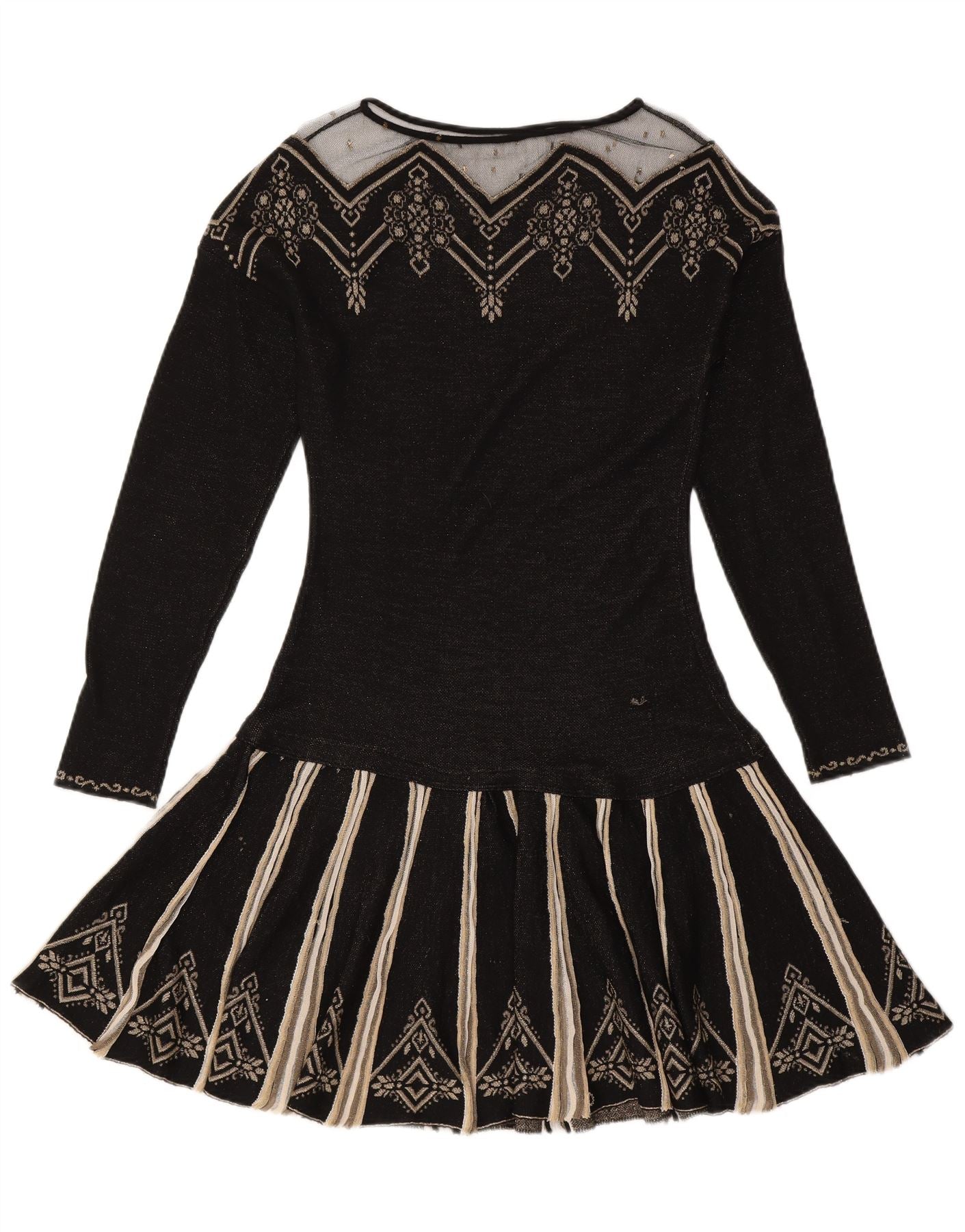 - AI Description: This Just Cavalli womens jumper dress is crafted from a comfortable black knit fabric. It features a classic round neck and long sleeves. The design showcases an abstract geometric pattern, subtly enhanced with sequin accents. A pullover style, it offers a regular fit for effortless wear. This dress combines classic structure with striking visual detail.