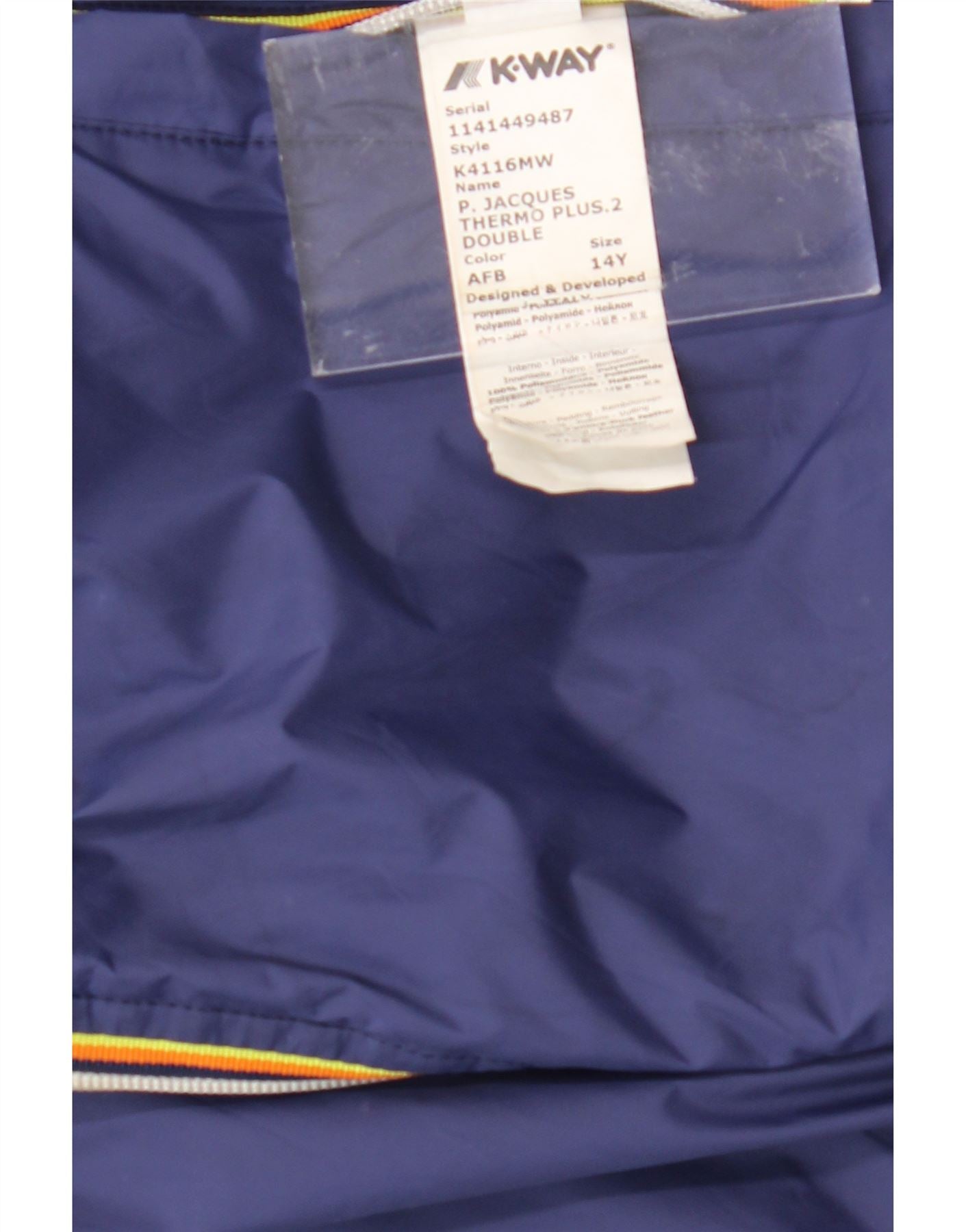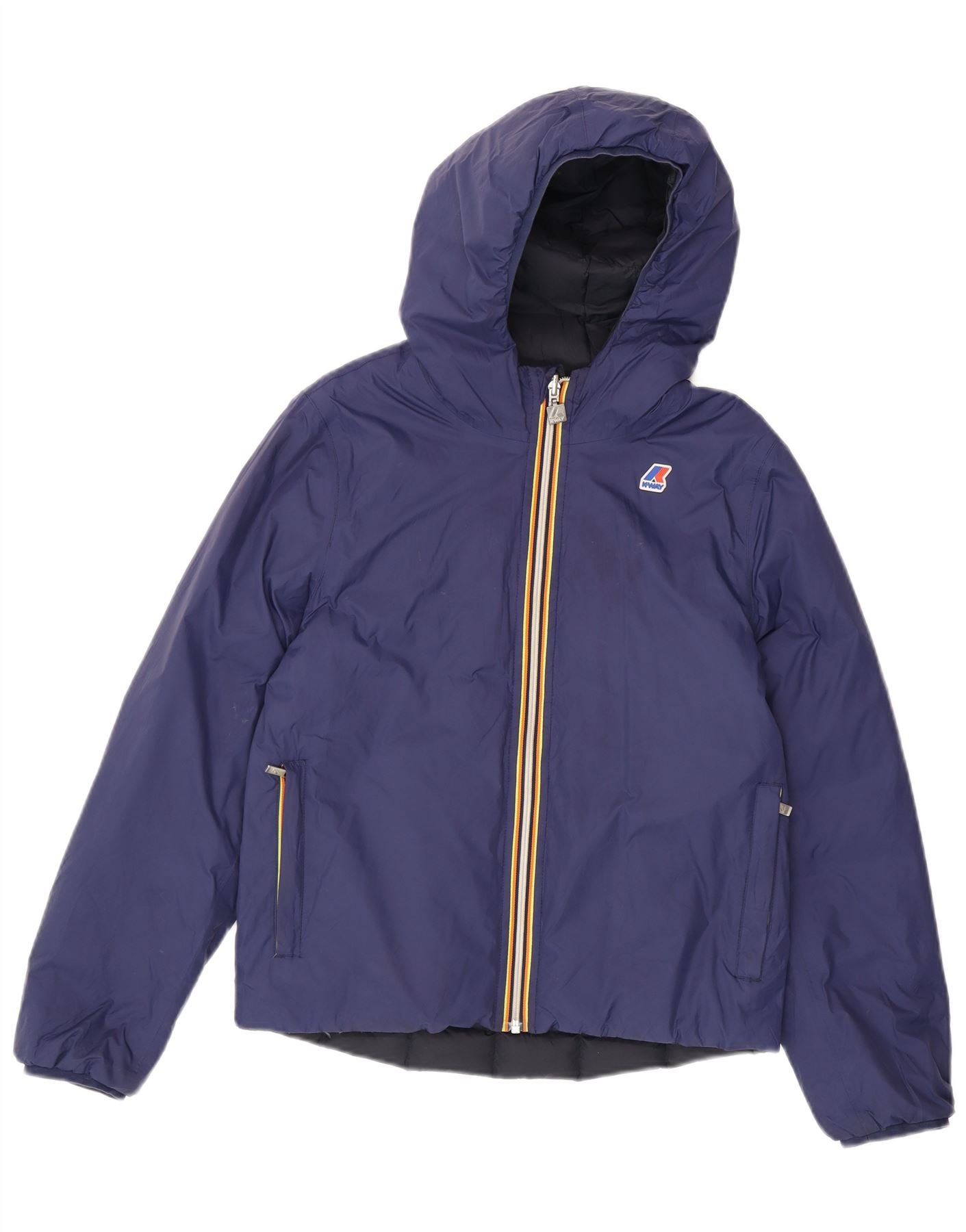 - AI Description: This K-Way girls' windbreaker jacket is crafted from durable woven polyamide, offering a smooth, water resistant finish. It features a practical hooded design and long sleeves. The regular fit ensures comfortable wear. A full zip closure provides easy fastening. This versatile jacket is also reversible, offering two styling options.