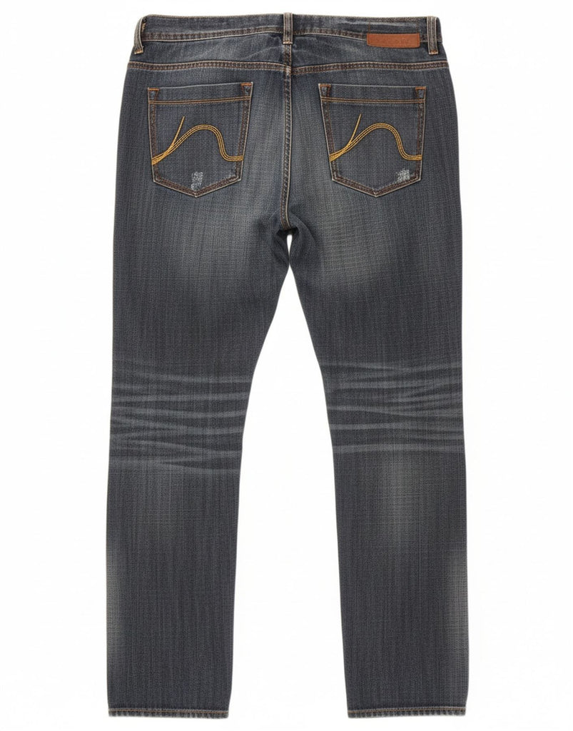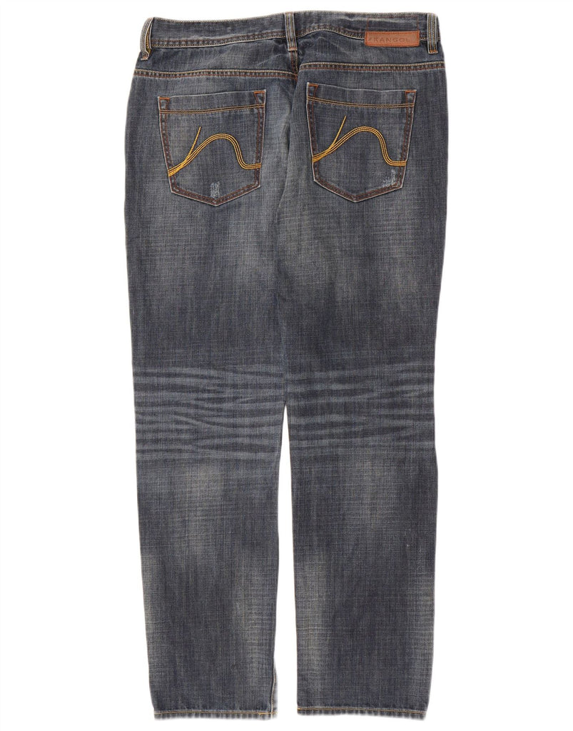 - AI Description: These Kangol mens straight jeans are crafted from blue cotton denim. The fabric features a distressed finish for a worn-in look. They offer a regular fit through the leg. A button closure secures the waist. Classic pockets provide practicality. A subtle logo accent adds brand recognition. These jeans combine comfort with a contemporary, casual style.