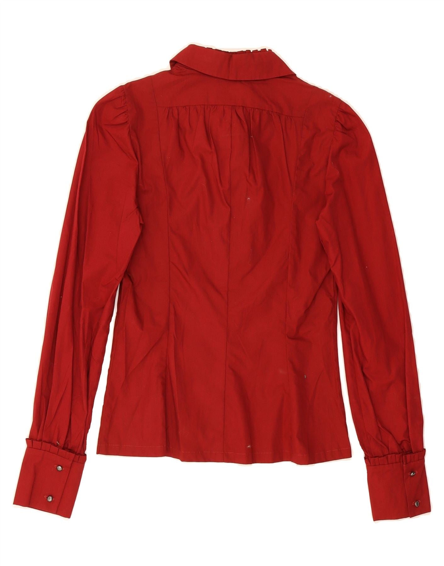 - AI Description: This pre-owned Kenzo blouse is a classic wardrobe staple. Crafted from 100% cotton in a vibrant red woven fabric, it features long sleeves, a collared neckline and button closure. The regular fit ensures comfort and style. While in excellent condition, there are minor defects of loose stitching on the sleeve, slight discoloration on the back, and visible wear on the tag. Label size 36.