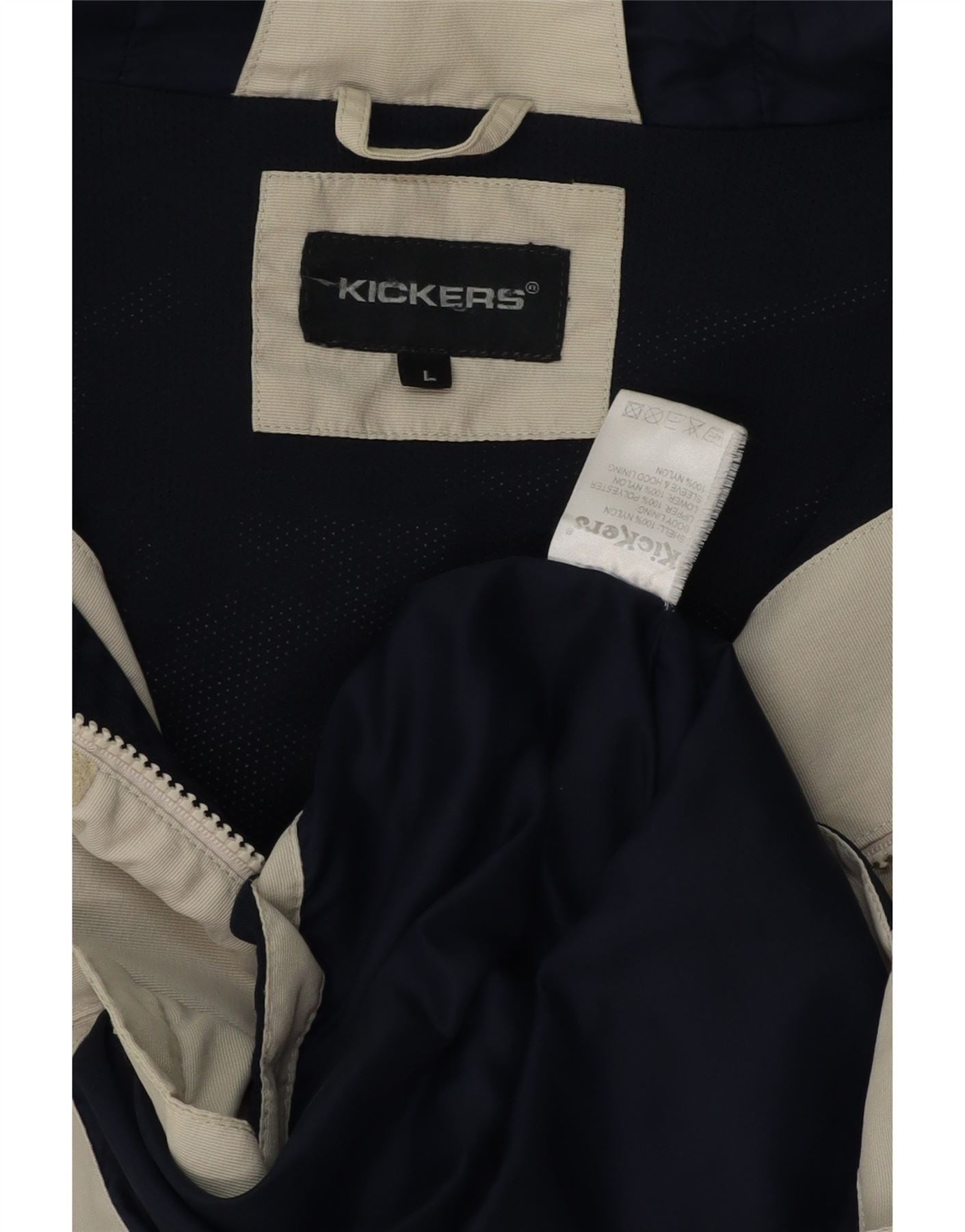 - AI Description: This Kickers mens Windbreaker Jacket is crafted from durable woven nylon in a versatile beige hue. It features a practical collared neckline and a full zip closure. Long sleeves and a regular fit ensure comfortable wear. A functional hood provides extra protection. Subtle pockets add utility. The design is finished with a distinctive brand logo accent. This modern style is perfect for everyday layering.