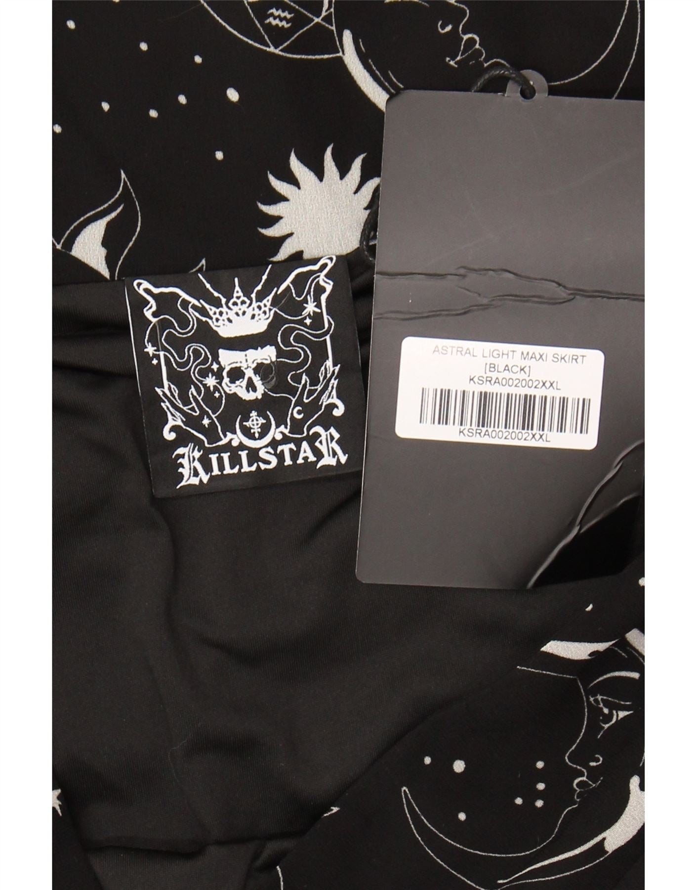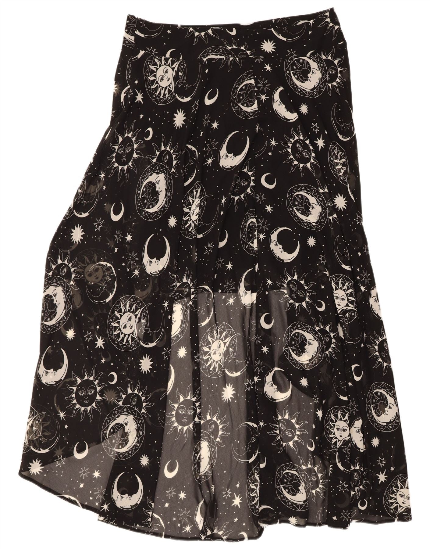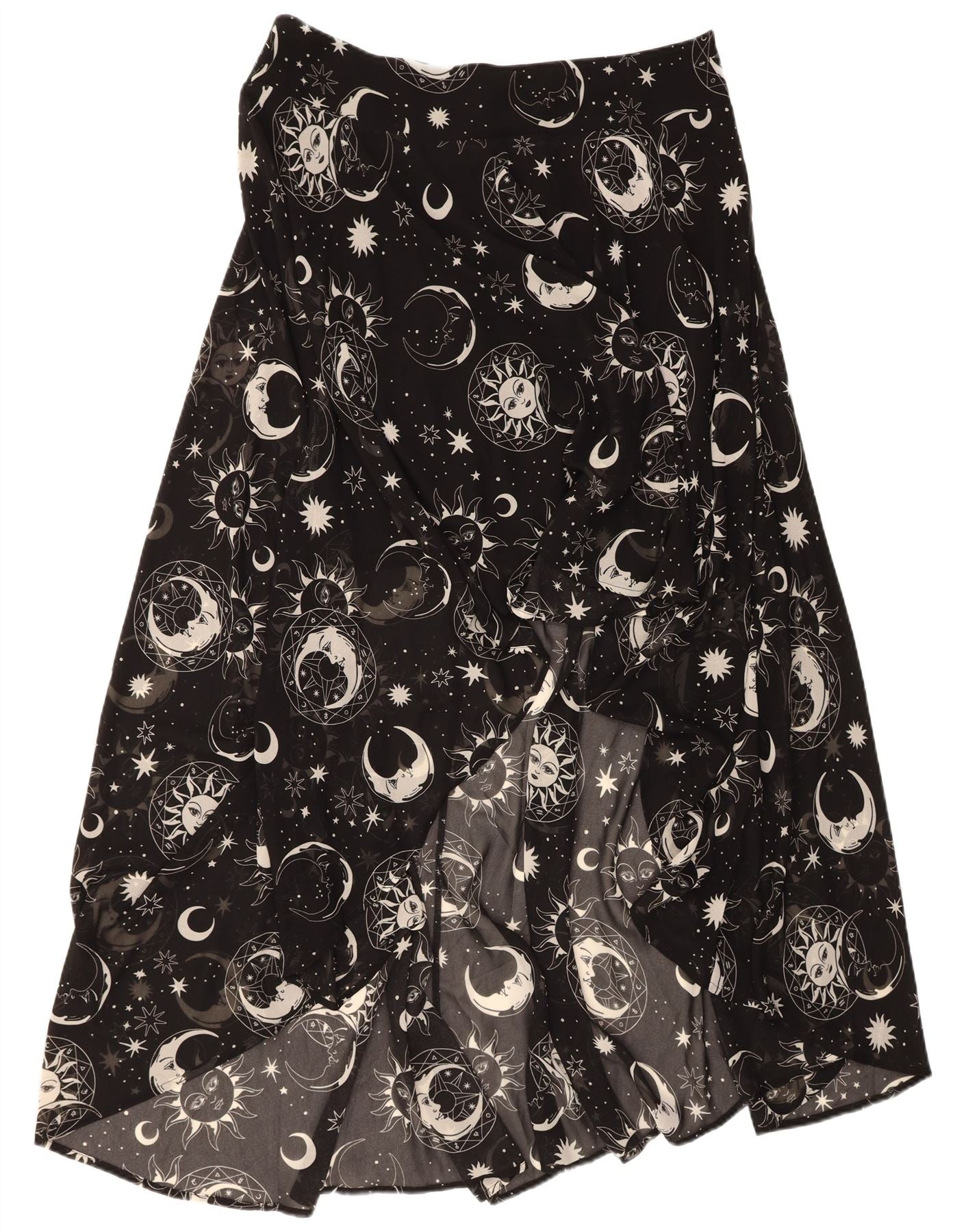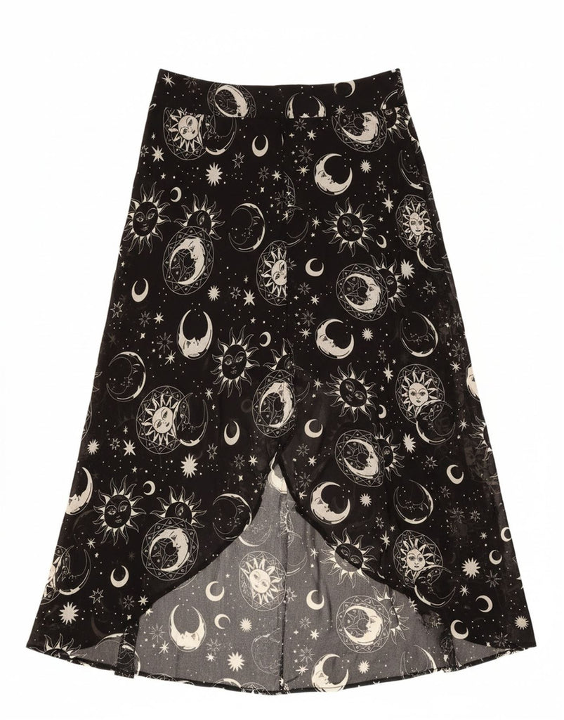 - AI Description: This Killstar womens Astral Light maxi skirt is crafted from flowing black chiffon. It features a wrap design and pullon closure, ensuring a regular fit. The long, A-line silhouette drapes elegantly, offering graceful movement. This skirt showcases a striking abstract pattern, enhancing its gothic style with a unique visual appeal.