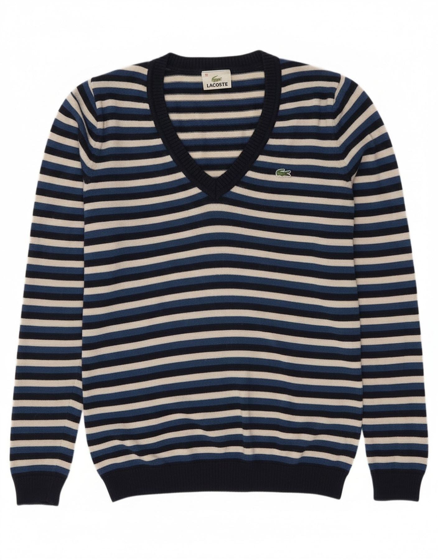 Maglione da donna con scollo a V Lacoste taglia 38 medio in lana a righe blu navy