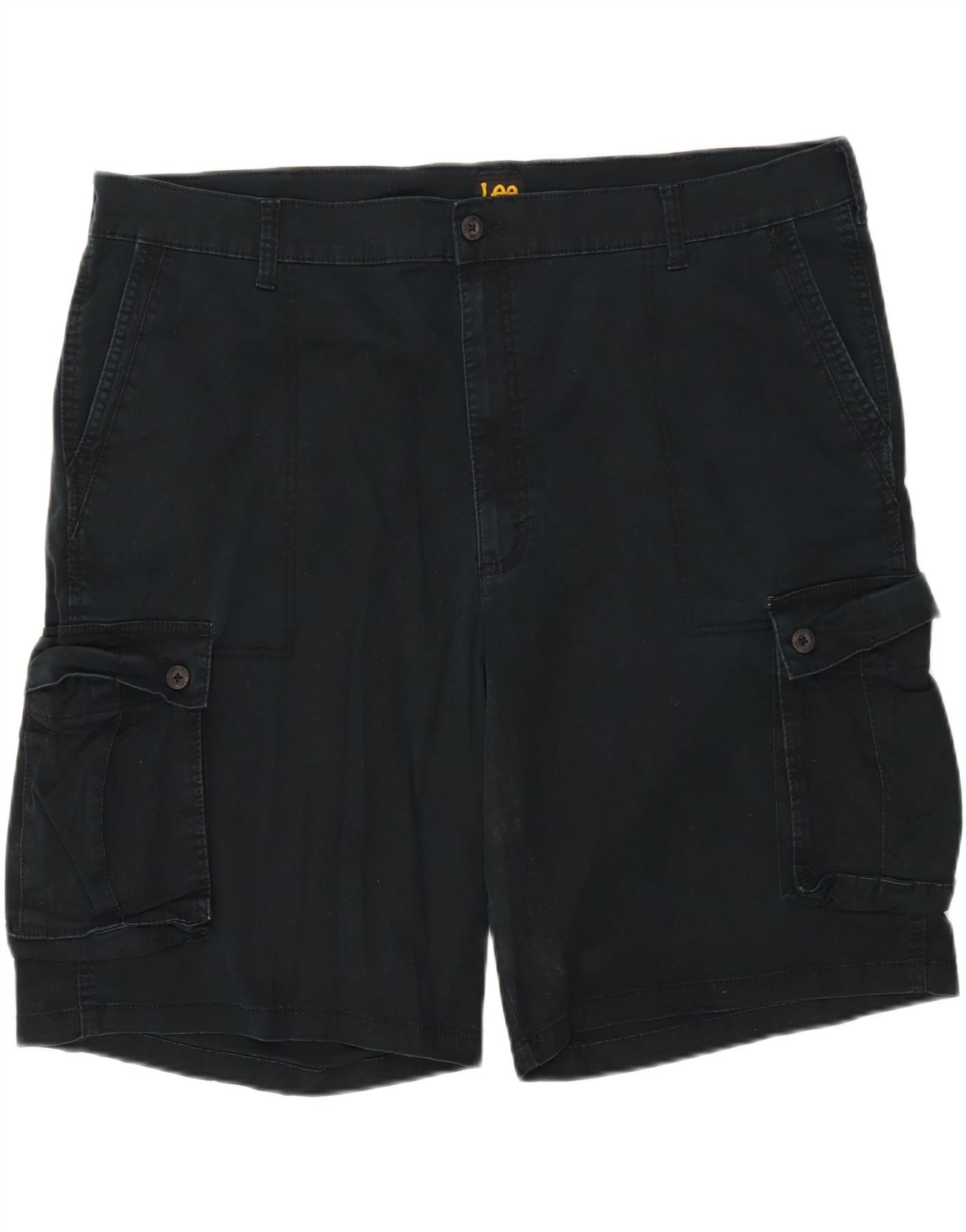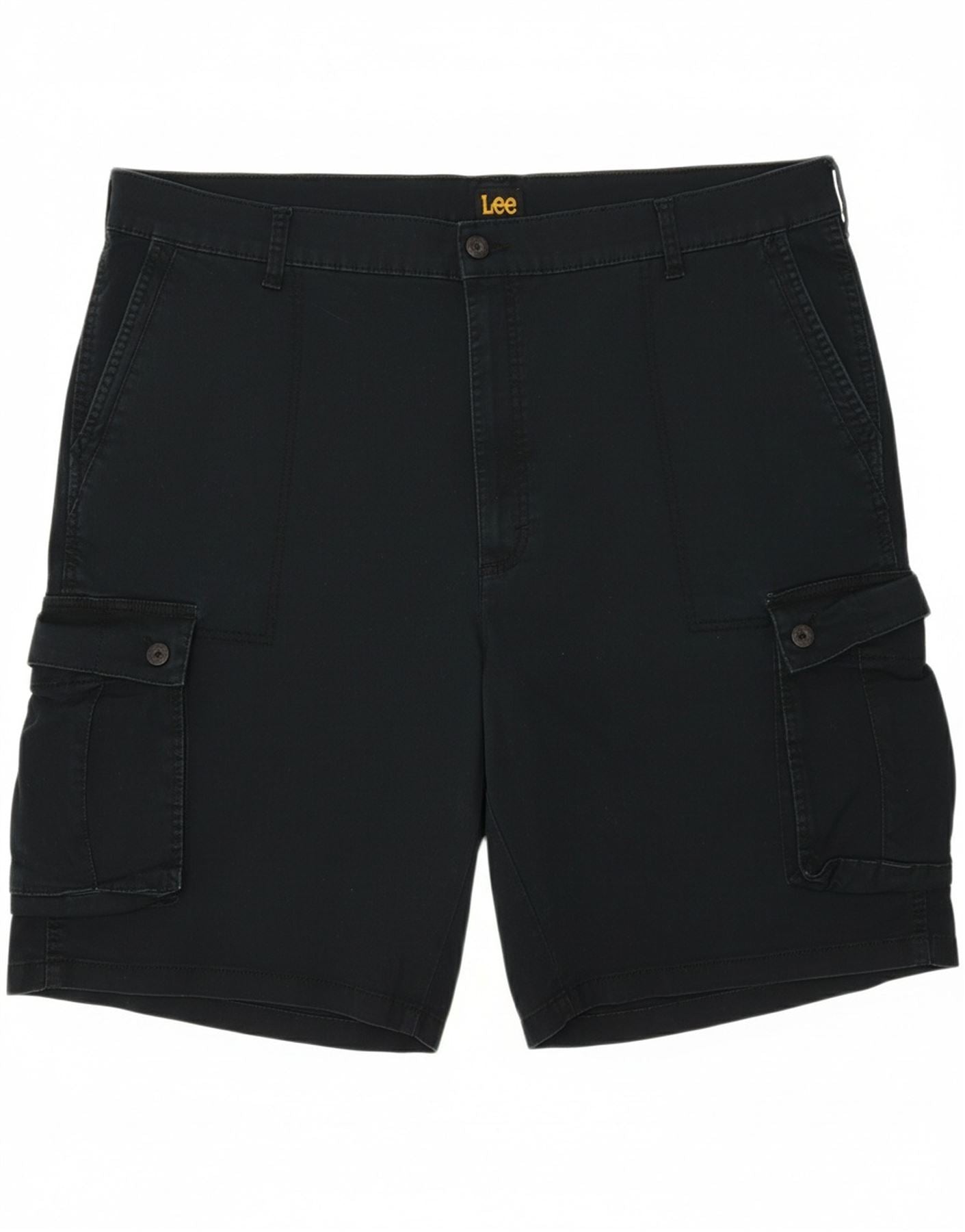 - AI Description: This Lee men's cargo shorts are crafted from a durable black blended fabric, offering both comfort and stretch. The classic design features a button closure and a relaxed fit, ensuring ease of movement. Multiple practical pockets enhance functionality and provide ample storage. The sturdy cotton blend material ensures lasting wear and a comfortable feel, perfect for everyday casual wear.
