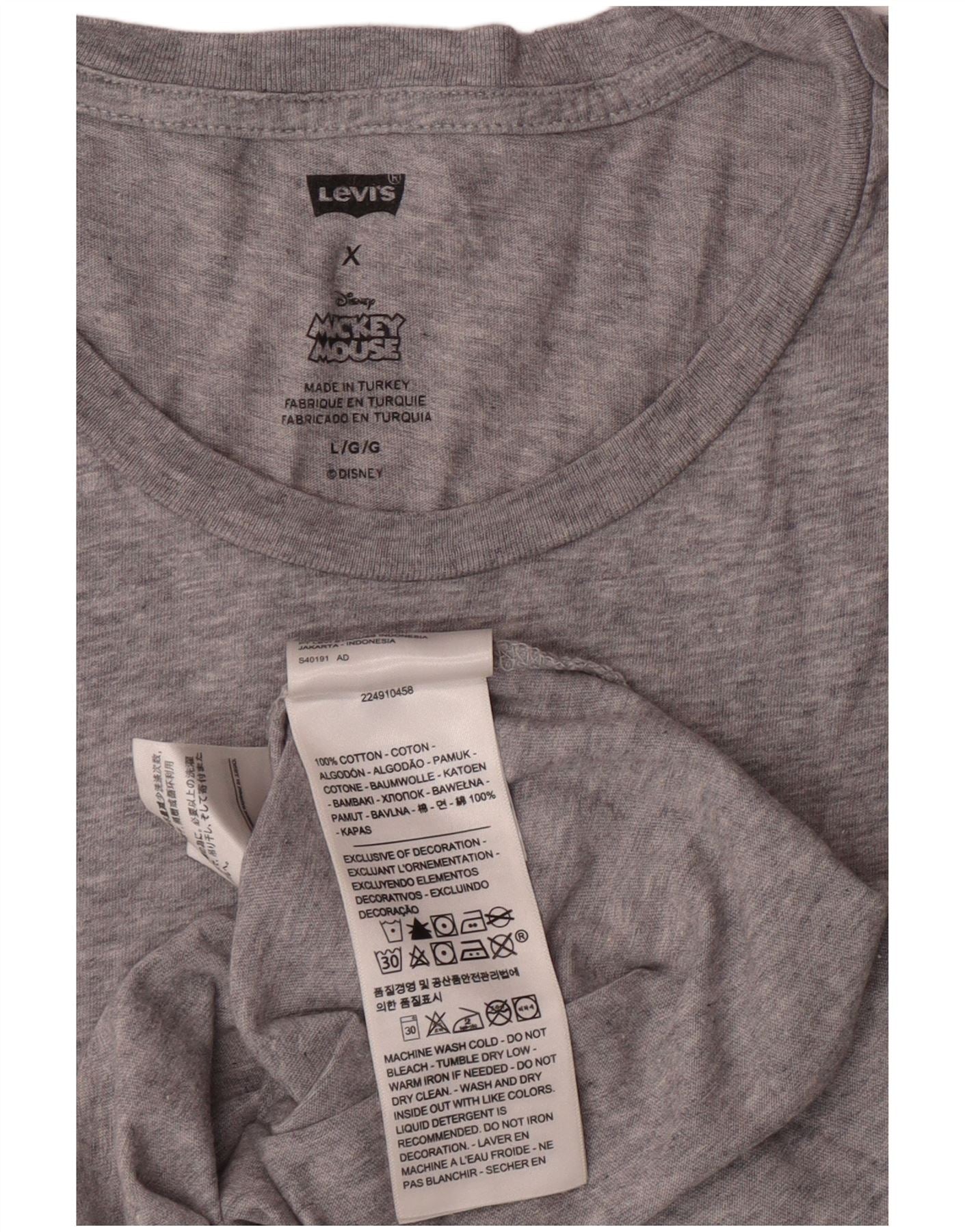 - AI Description: This Levi's men's Graphic T-Shirt Top is crafted from soft grey cotton knit for comfortable wear. It features a classic round neck and short sleeves. The regular fit ensures a relaxed silhouette. A prominent Mickey Mouse graphic print adorns the front. This iconic comic design adds a playful, distinctive touch, perfect for casual styling. The pullover style offers easy wear.