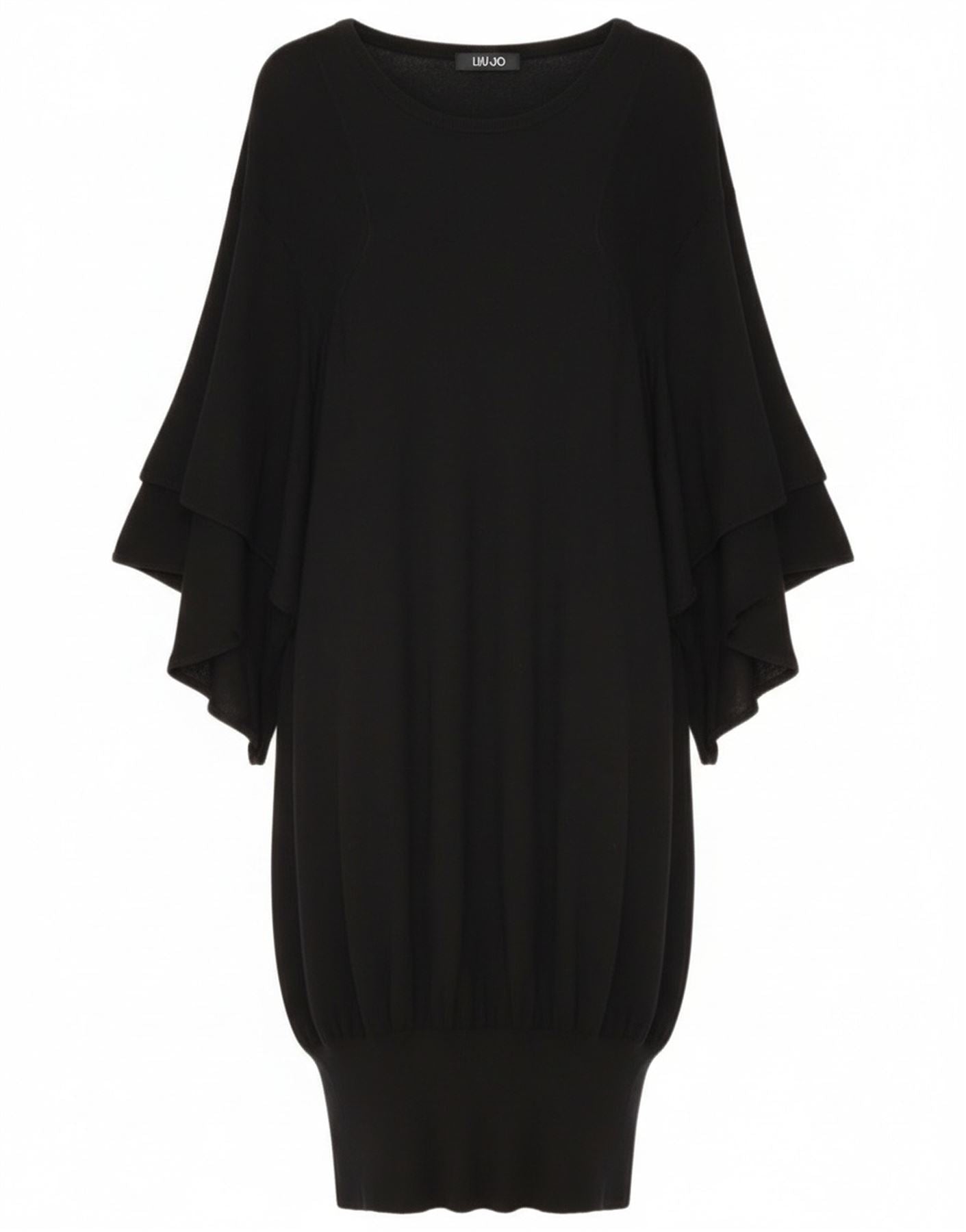 - Descrizione dell'IA: Questo abito da donna Liu Jo è realizzato in un comodo tessuto a maglia nero elasticizzato. Presenta un collo rotondo e un design pullover. Le maniche corte hanno un caratteristico taglio ad ala di pipistrello con dettagli volant. La vestibilità regolare offre una silhouette rilassata ma elegante. Gli accenti a strati aggiungono interesse visivo a questo pezzo versatile, garantendo comfort e stile contemporaneo.