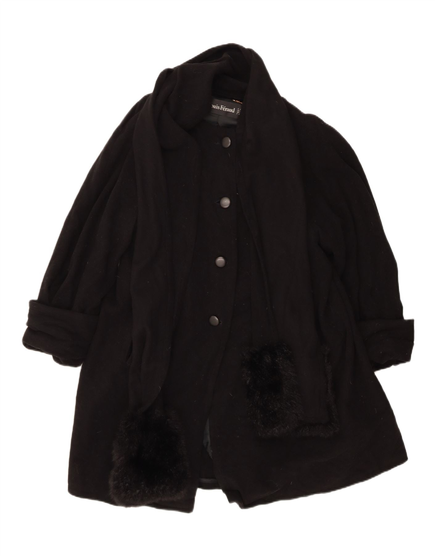 - Descrizione dell'IA: Questo cappotto da donna Louis Feraud è realizzato in lussuosa lana intrecciata nera, offrendo una trama sofisticata. Presenta uno scollo classico con colletto e maniche lunghe. La parte anteriore è fissata con un'elegante chiusura a bottone. Pratiche tasche e bordo in morbida pelliccia aggiungono dettagli raffinati. Completamente foderato per il massimo comfort, la sua vestibilità regolare garantisce una silhouette intramontabile e indossabile.