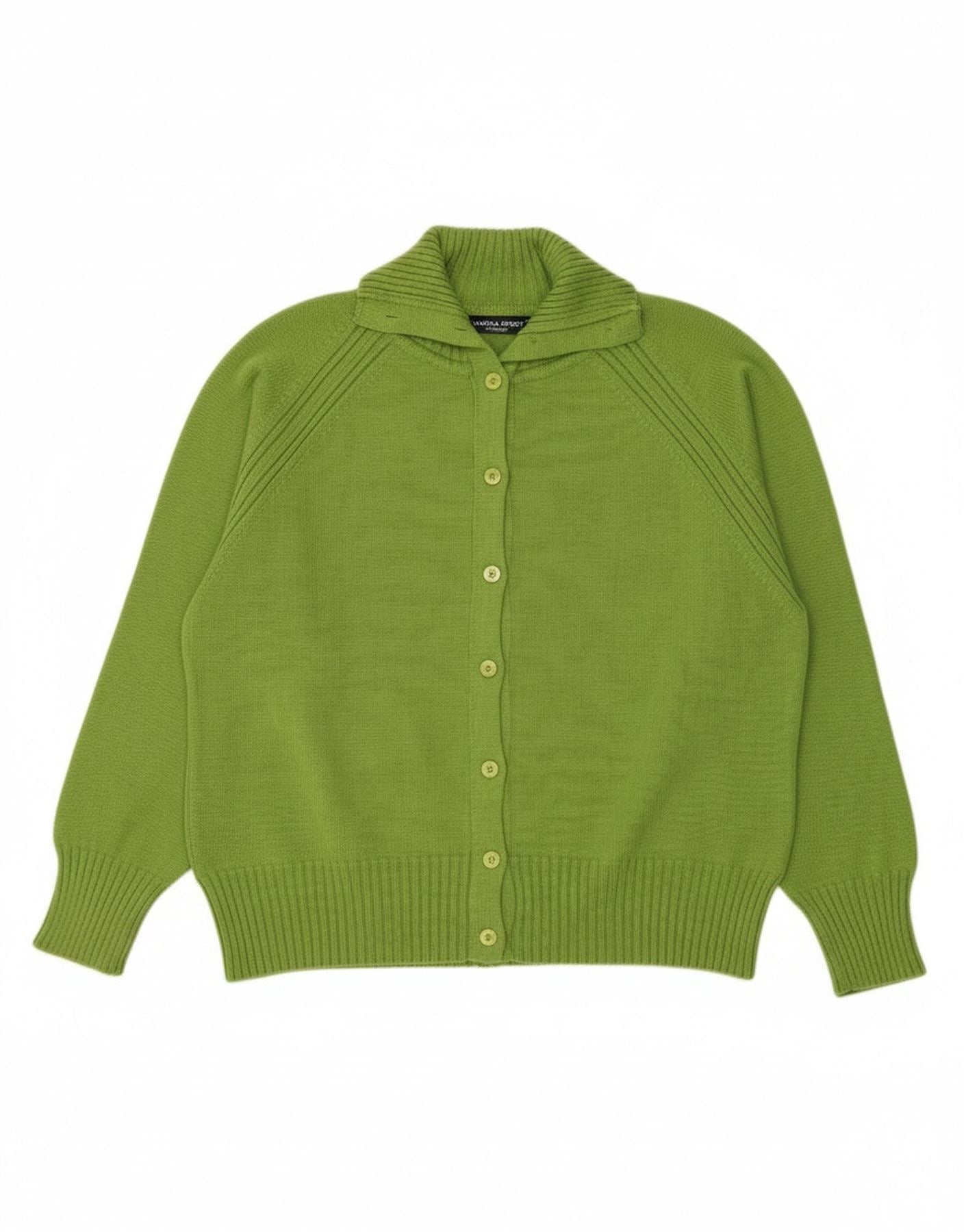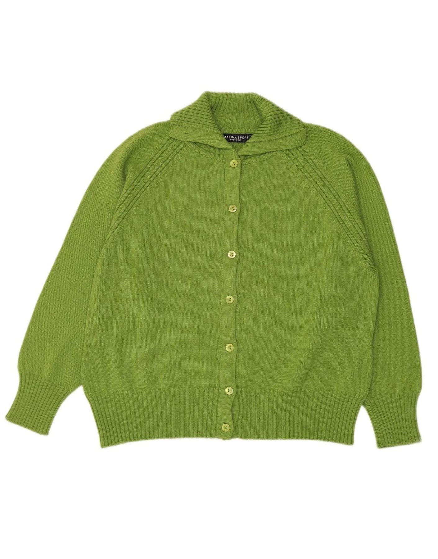- AI Description: This Marina Sport womens cardigan sweater is crafted from a soft wool and acrylic blend. It features an elegant shawl neck, leading to a collared neckline. The button-up front offers versatile closure. Long sleeves provide warmth. This green knit garment has a comfortable regular fit, perfect for smart layering.