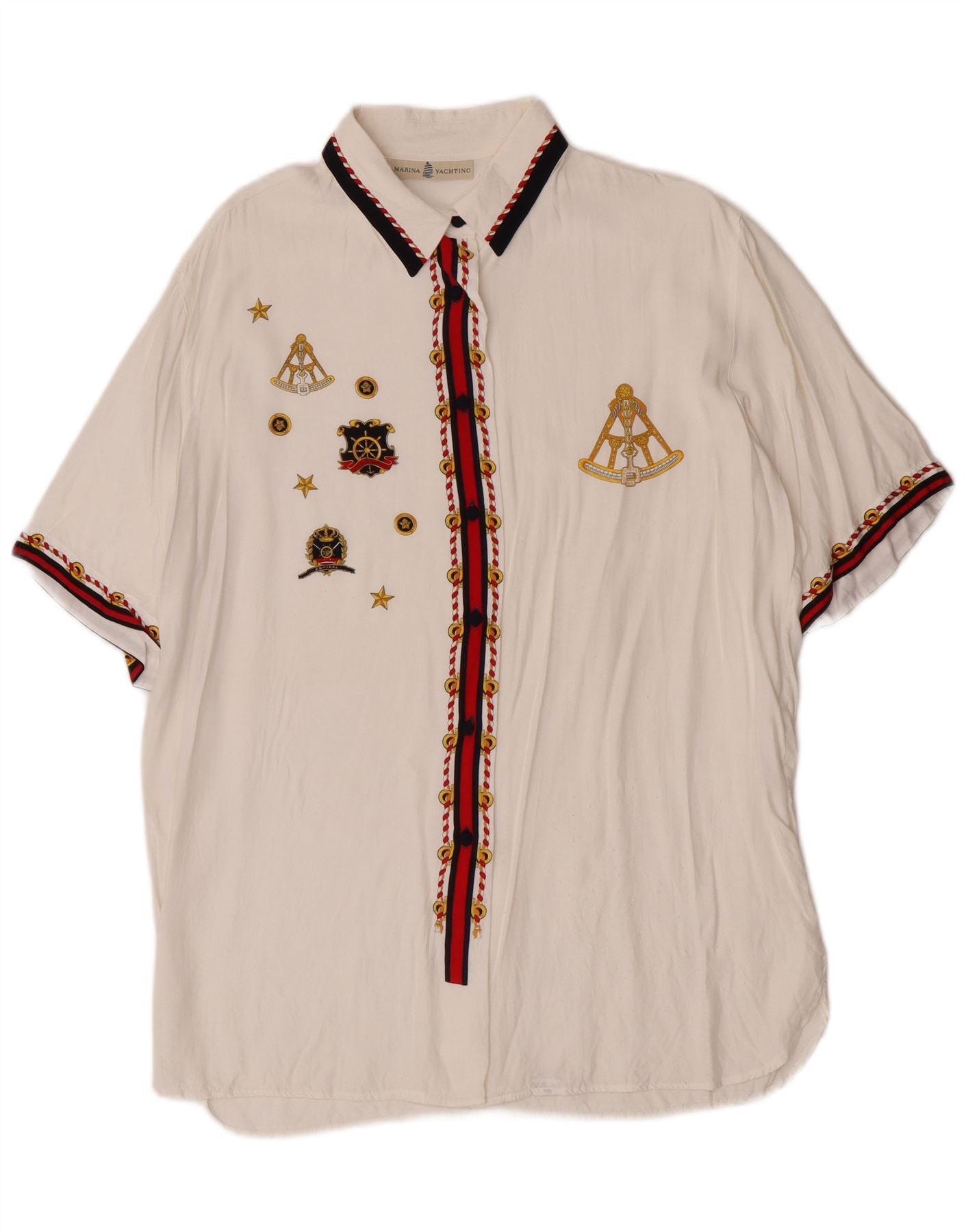 - Descrizione dell'IA: Questa camicia da donna Marina Yachting è realizzata in leggera e morbida viscosa bianco sporco. Presenta un classico scollo con colletto e maniche corte. L'abbottonatura frontale è ornata da una caratteristica striscia ricamata rossa e oro. Grafica ricamata e stelle a tema nautico impreziosiscono la parte anteriore. Offre una vestibilità rilassata e ampia per il comfort e un look elegante.