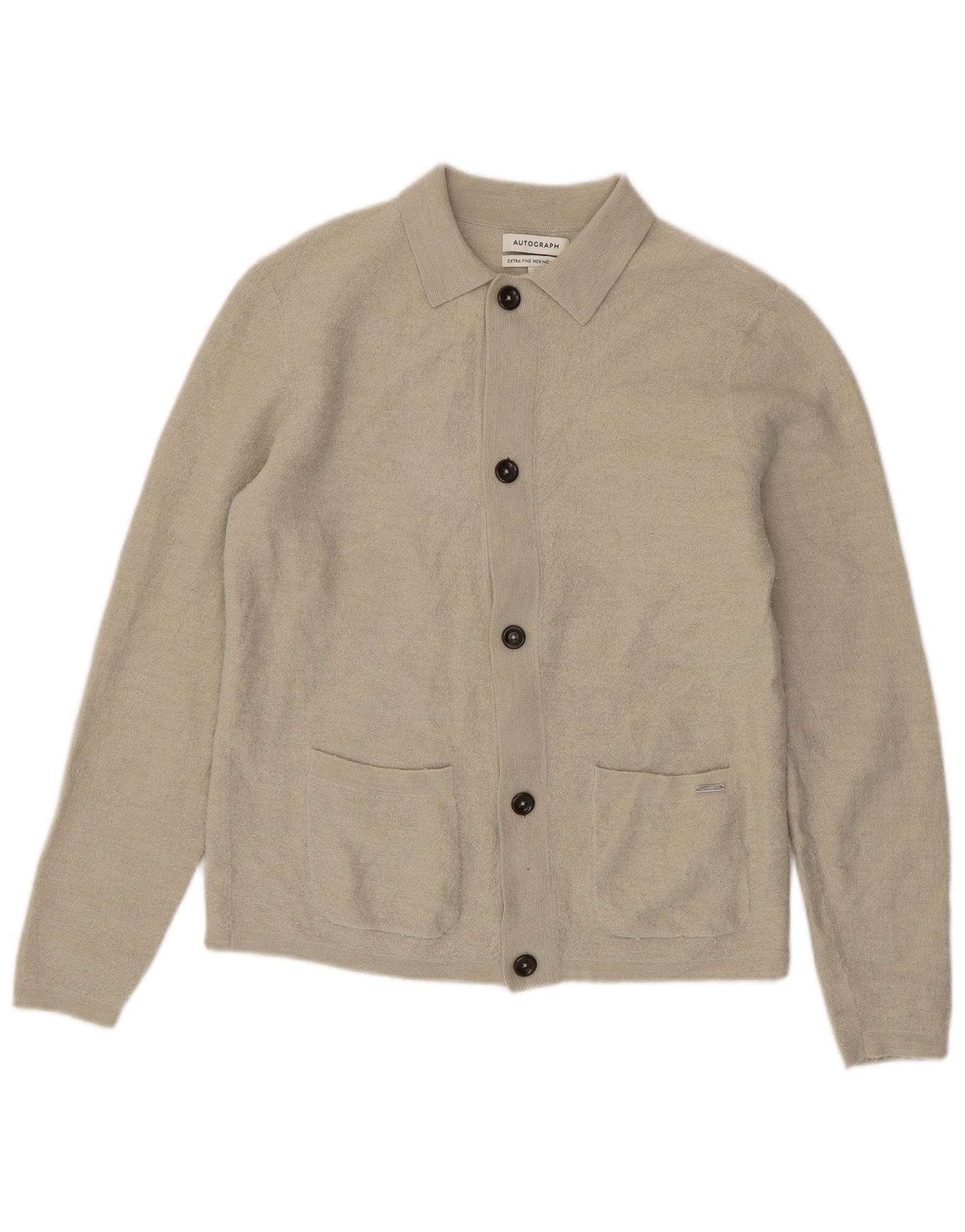- Descrizione dell'IA: Questo maglione cardigan da uomo Autograph è realizzato in lussuosa lana merino extra fine al 100%. La sua maglia beige offre una texture morbida e raffinata. Presenta uno scollo classico con colletto e maniche lunghe. La vestibilità regolare garantisce una vestibilità comoda. L'abbottonatura frontale completa con bottoni tono su tono fornisce una chiusura ordinata. Due pratiche tasche frontali aggiungono dettagli funzionali a questo capo versatile.