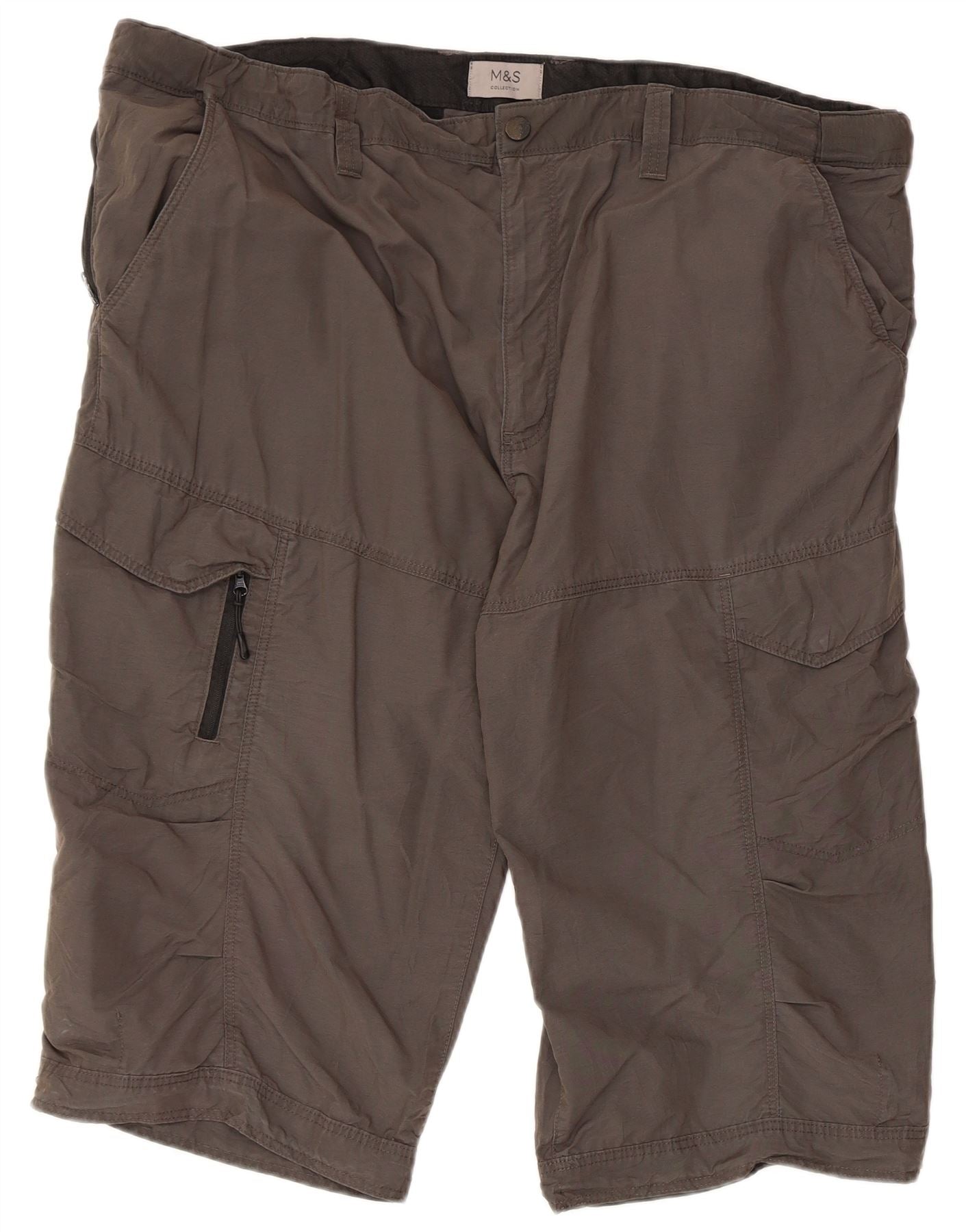 - AI Description: This Marks & Spencer mens Cargo Shorts are crafted from a durable grey woven fabric. They feature a regular fit and a comfortable relaxed cut. The zip closure ensures a secure fastening. Multiple pockets, including zipped pockets, offer practical storage. These shorts combine utility with a smart casual aesthetic, perfect for everyday wear.