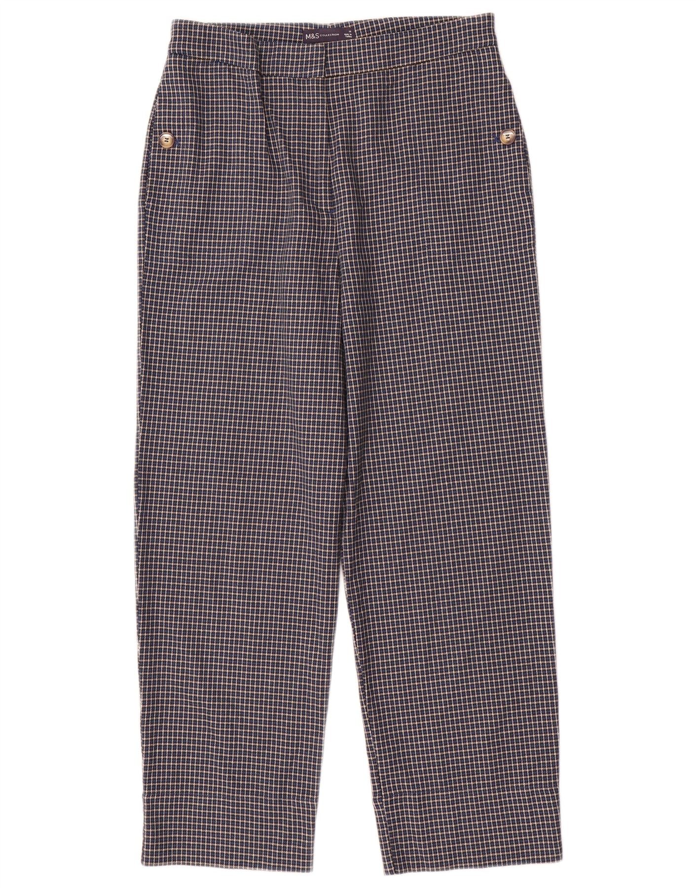 - Descrizione dell'IA: Questi pantaloni cropped da donna Marks Spencer sono realizzati in un comodo misto poliestere elasticizzato. Presentano un classico motivo a quadri blu navy. La vita media e la vestibilità regolare offrono una silhouette lusinghiera. Una chiusura con zip garantisce una parte anteriore liscia. Le gambe tagliate forniscono una finitura moderna. Le tasche laterali aggiungono praticità. I sottili bottoni in vita esaltano lo stile classico.