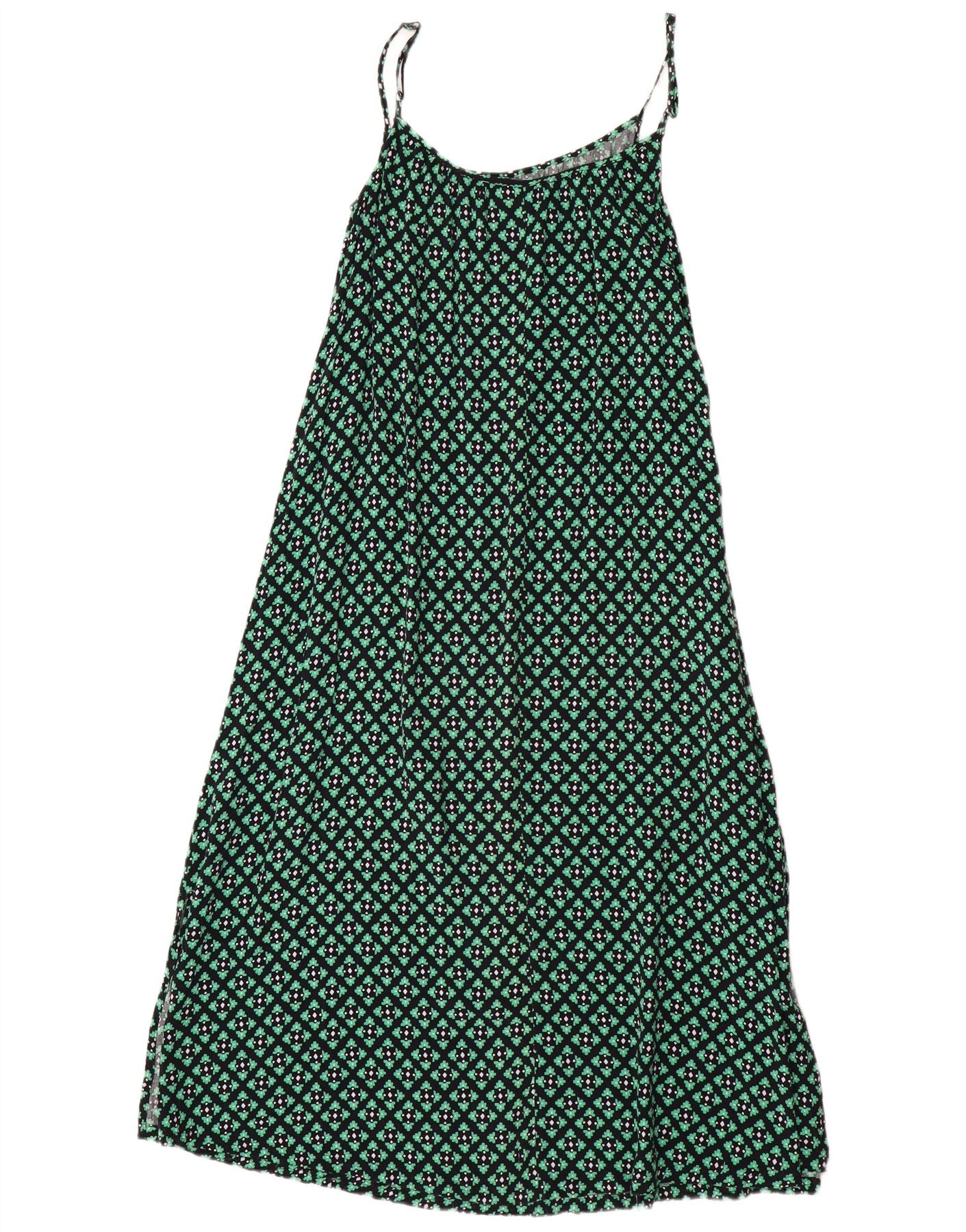 - Descrizione dell'IA: Questo abito sottoveste da donna Marks & Spencer è realizzato in viscosa leggera e offre un drappeggio liscio e fluido. Presenta un sorprendente motivo geometrico in verde, nero e bianco. Il design senza maniche con spalline delicate e scollo rotondo crea una silhouette rilassata. La sua vestibilità ampia garantisce comfort e stile disinvolto. Questo vestito pullover è perfetto per la stagione calda.