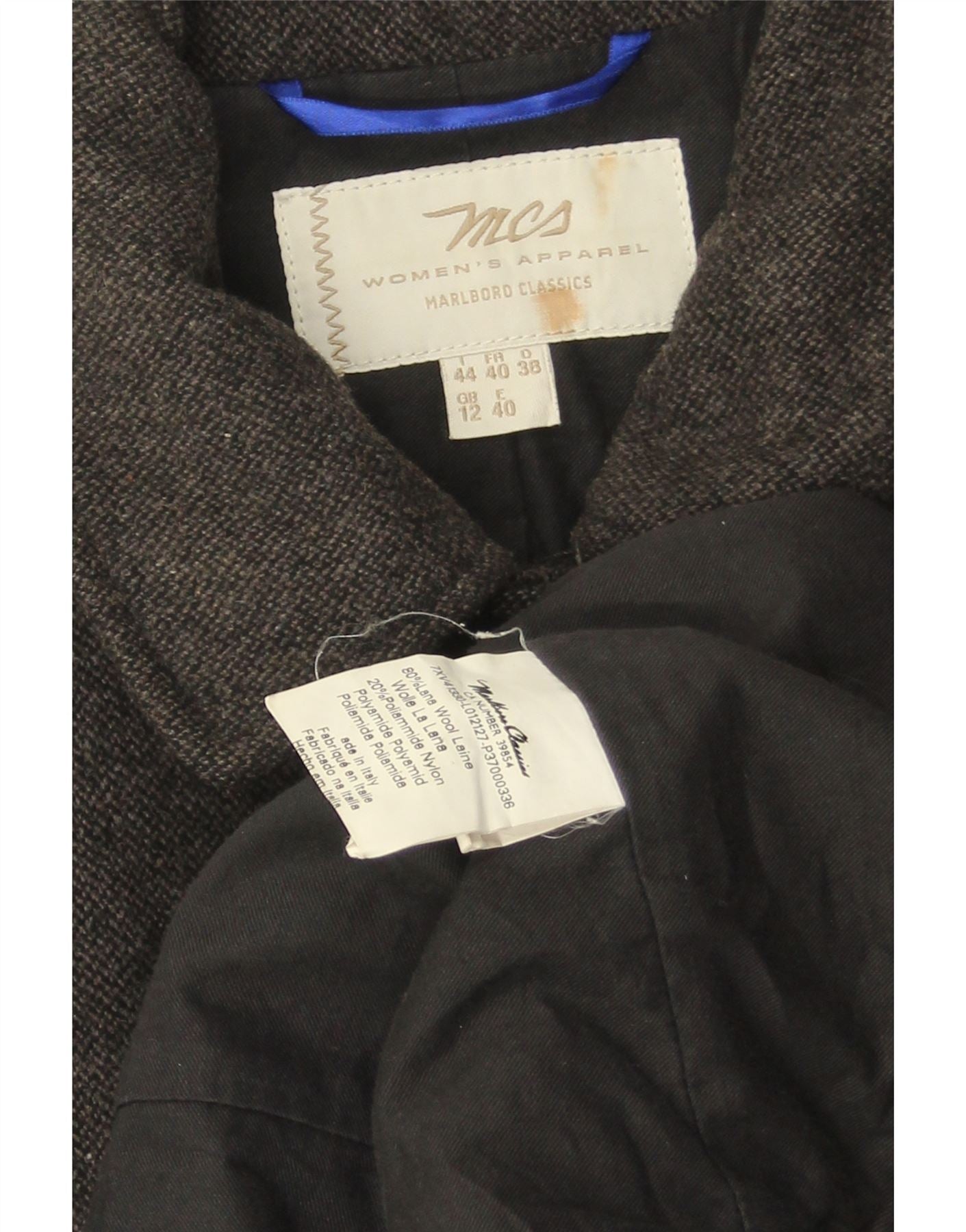 - AI Description: This MCS Marlboro Classics womens coat is crafted from a luxurious grey wool blend, offering warmth and a refined texture. It features a classic collared neckline and long sleeves. The regular fit ensures comfortable wear. A single button closure provides a sleek front. Subtle pockets add practical detail. This classic style is perfect for sophisticated layering.
