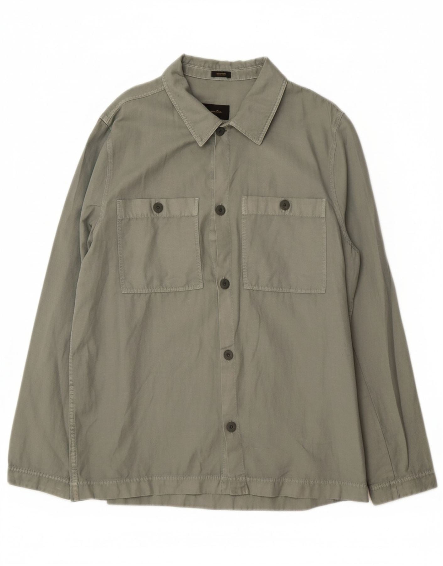 - AI Description: This Massimo Dutti men's overshirt is crafted from a lightweight khaki cotton linen blend. The blended fabric offers a breathable, comfortable texture. It features a classic collared neckline and a full button closure. Long sleeves taper neatly for a refined yet relaxed feel. The regular fit is designed for layering. Practical pockets on the chest add to its utilitarian, army-inspired style. Tonal buttons complete the understated design.