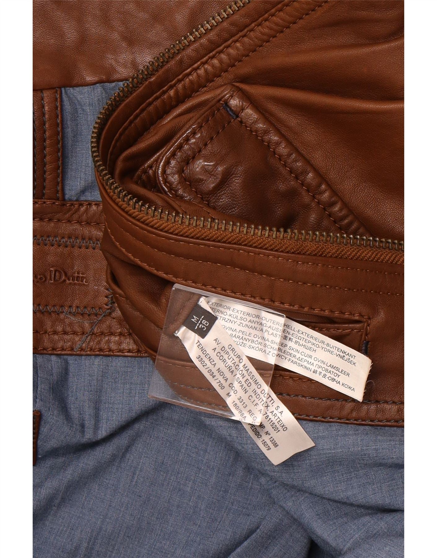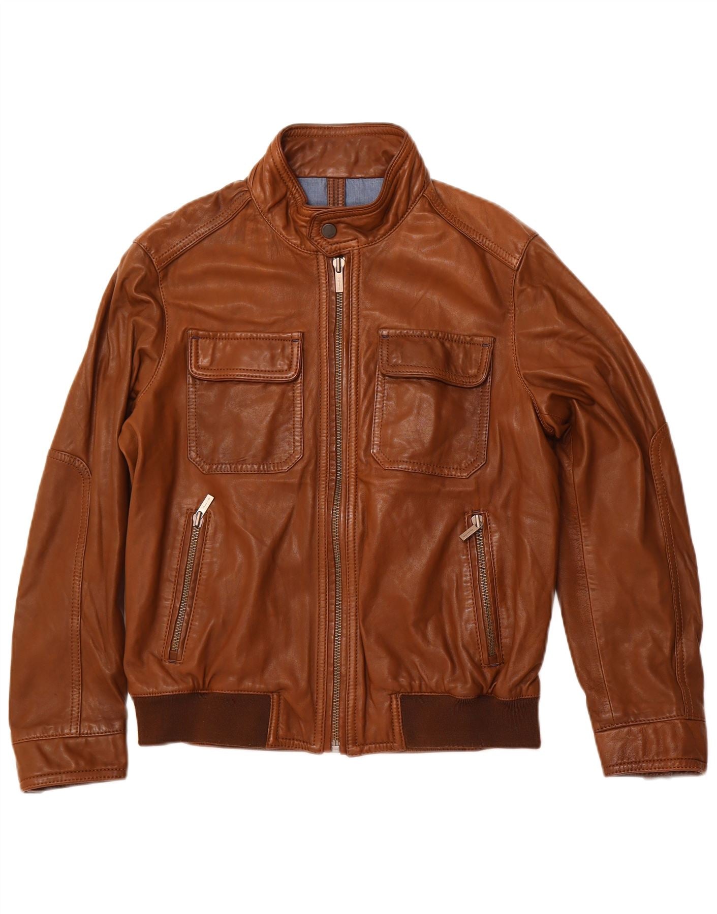 - AI Description: This Massimo Dutti mens bomber jacket is crafted from luxurious brown lambskin leather. It features a classic collared neckline and a full zip closure for a sleek finish. Long sleeves and a regular fit ensure comfortable wear. Practical pockets add functionality. The biker style offers a timeless, rugged appeal.