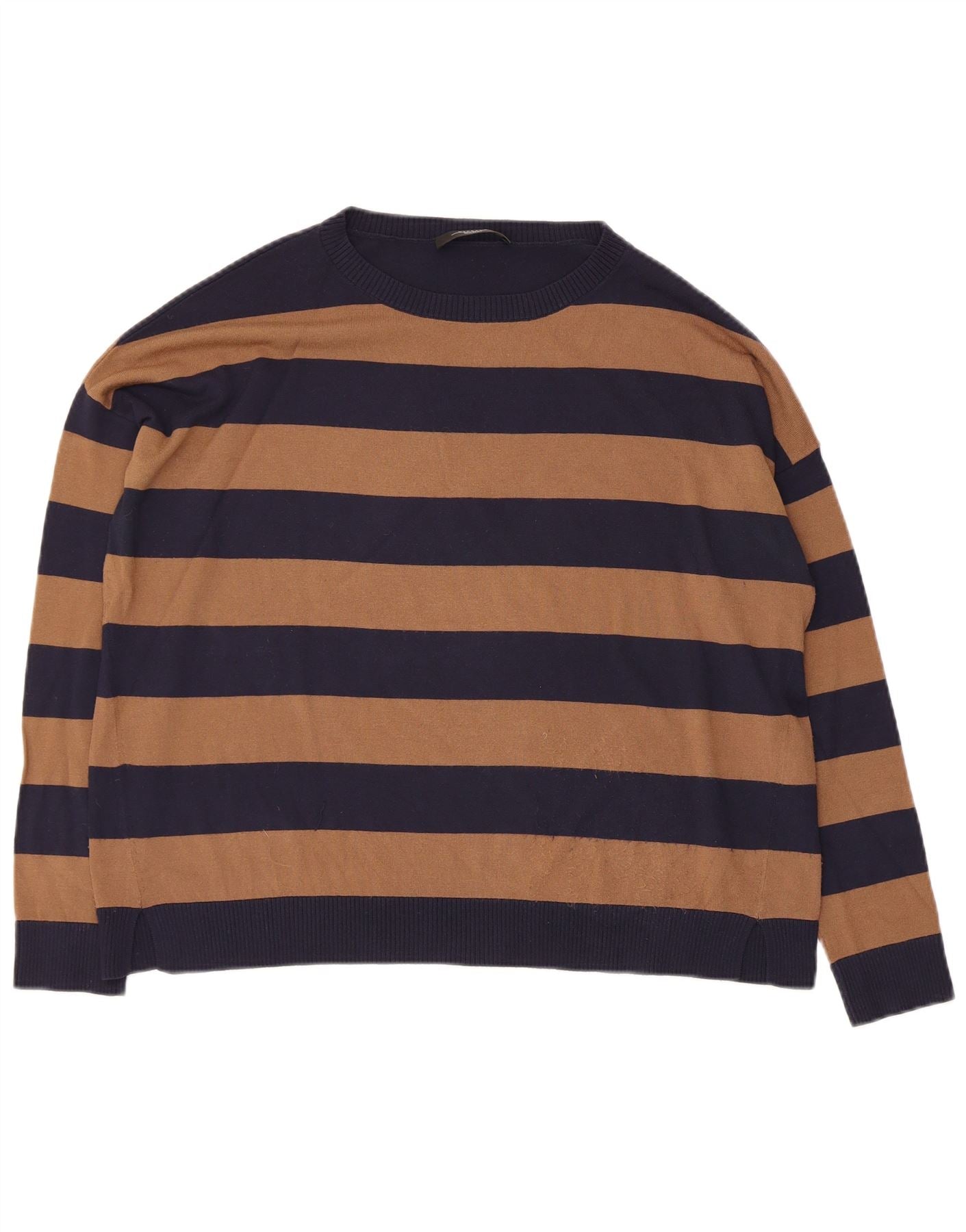 - Descrizione dell'IA: Questo maglione girocollo da donna Max Mara è realizzato in un leggero misto maglia di viscosa che offre comfort e una sensazione morbida. Presenta un classico motivo a righe nei toni contrastanti del blu navy e del marrone. Lo scollo rotondo e le maniche lunghe garantiscono una silhouette senza tempo. Progettato per una vestibilità ampia e rilassata, garantisce un'usura senza sforzo. Questo stile di maglione combina il design classico con il comfort moderno.