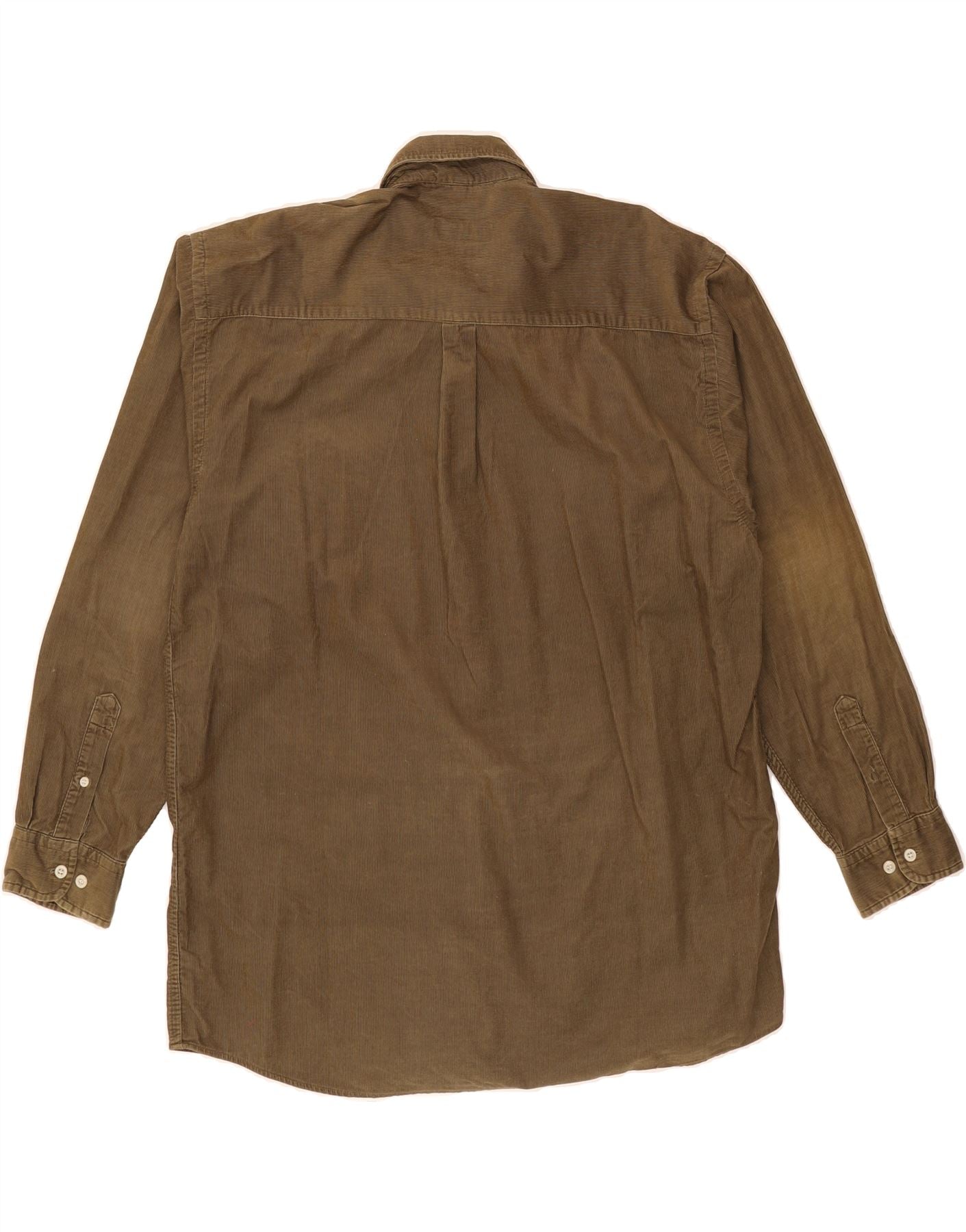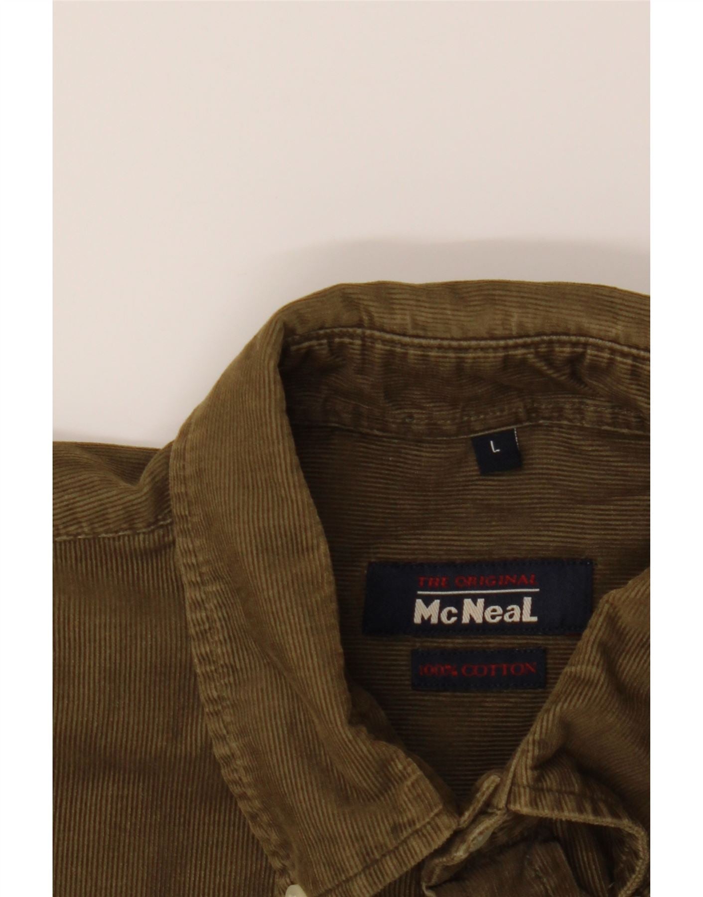 - AI Description: This pre-owned MC Neal shirt, size L, is a classic corduroy piece for men. Crafted from 100% cotton, its brown striped pattern and regular fit offer timeless style. Features include long sleeves, a collared neckline, button closure, cuffed sleeves and practical pockets. Note moderate discoloration on the back shoulders. Accented with buttons, it has a logo detail. Ideal for casual wear.