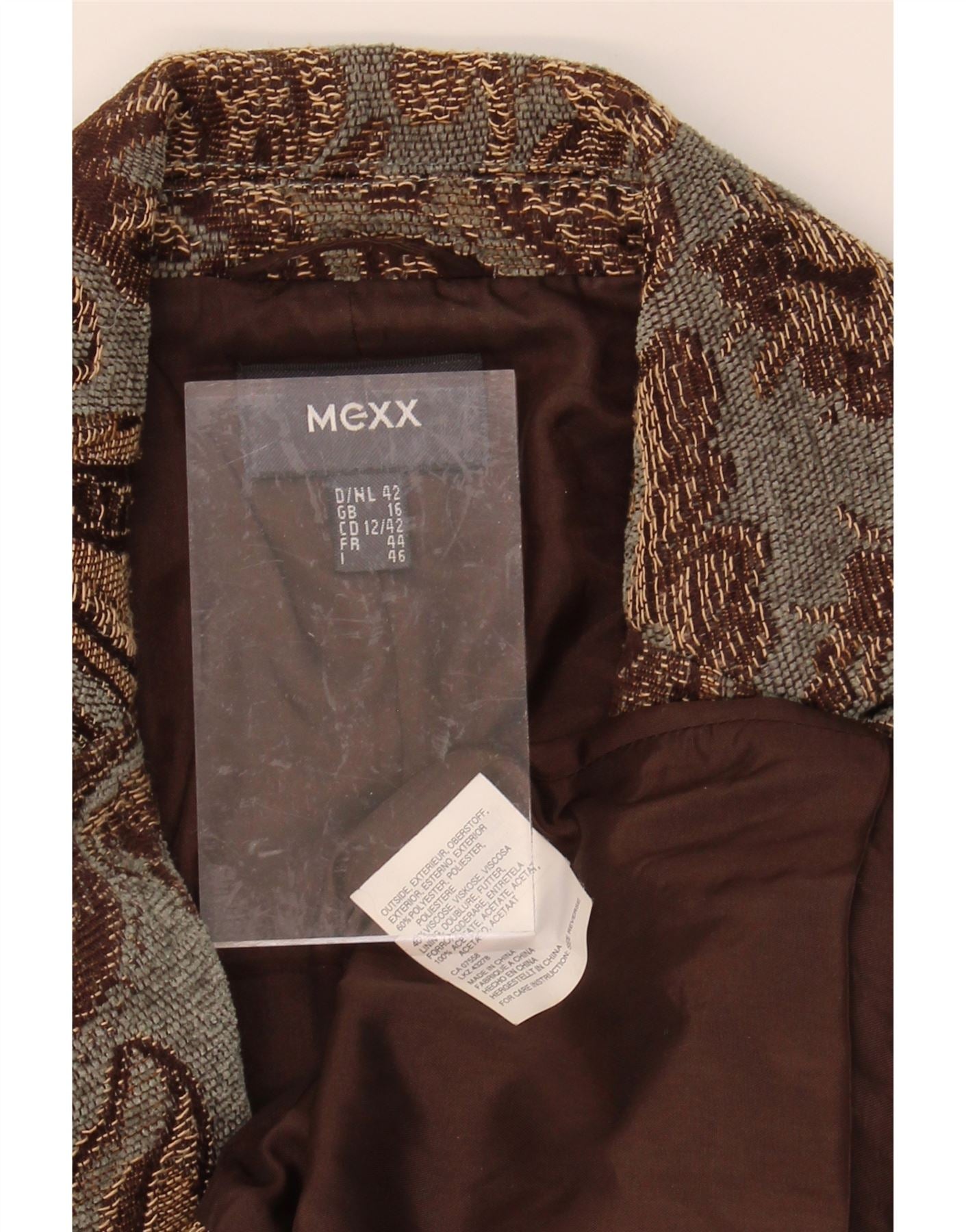 - AI Description: This pre-owned Mexx blazer jacket features a classic style with a brown floral jacquard pattern. Crafted from an acetate blend (55% acetate, 45% polyester) with a 100% viscose lining, this lined blazer has a regular fit, long sleeves, and a collared neckline. It features button closure, button accents, pockets, and shoulder pads. Size 42. Condition is good, with minor loose stitching on the sleeve. Care instructions: see care instruction label. RRP: £30.00.
