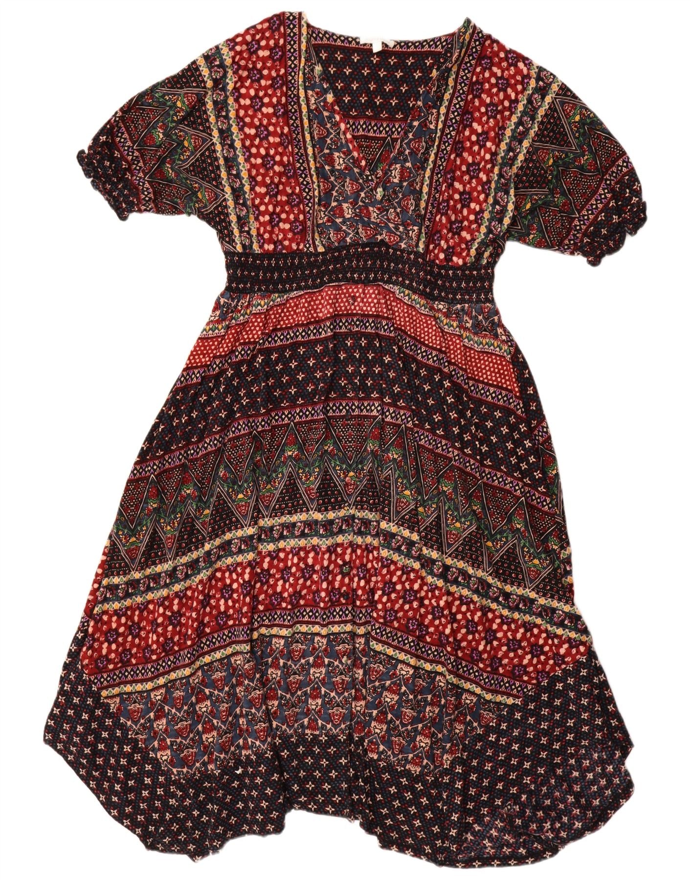 - Descrizione dell'IA: Questo abito impero da donna Monsoon è realizzato in un tessuto leggero e offre una vestibilità comoda e rilassata. Presenta un vivace motivo geometrico multicolore, che fonde ricchi rossi, blu e neri. Lo scollo a V e le maniche corte incorniciano la parte superiore del corpo. La vita stile impero si stringe dolcemente, sfociando in una gonna rilassata. Lo stile pullover garantisce facilità d'uso, incarnando un fascino bohémien.
