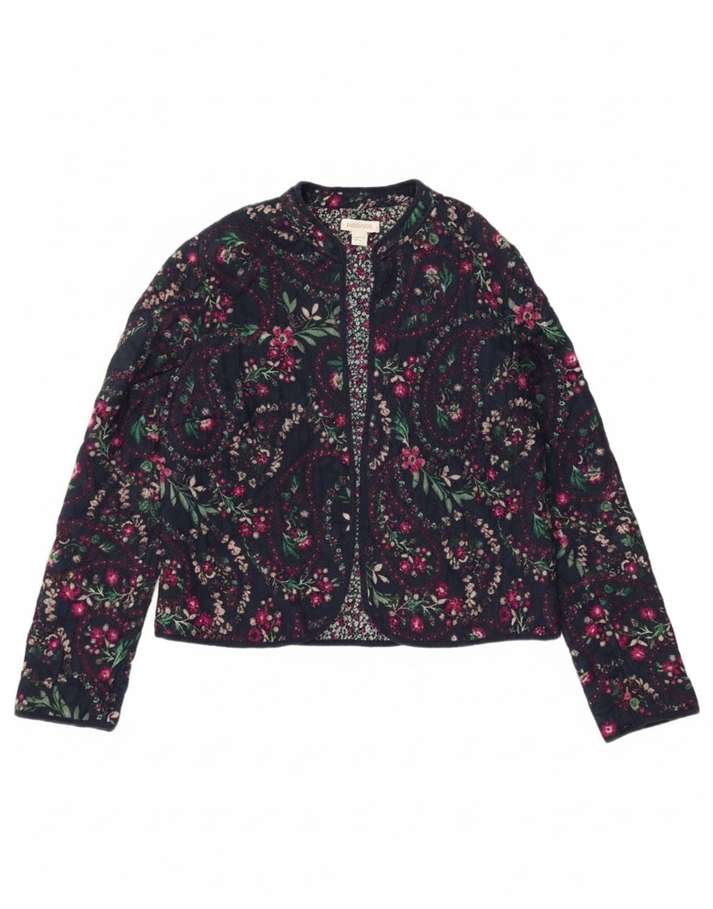 - Descrizione dell'IA: Questa giacca trapuntata da donna Monsoon è realizzata in tessuto con una comoda finitura trapuntata. Presenta una ricca base blu navy ornata da un vivace motivo floreale. Il girocollo e le maniche lunghe offrono una silhouette classica. Una chiusura con gancio e occhiello fornisce una parte anteriore ordinata. La vestibilità regolare garantisce comfort e facilità di indossabilità. Questa giacca foderata unisce lo stile bohémien al calore pratico.
