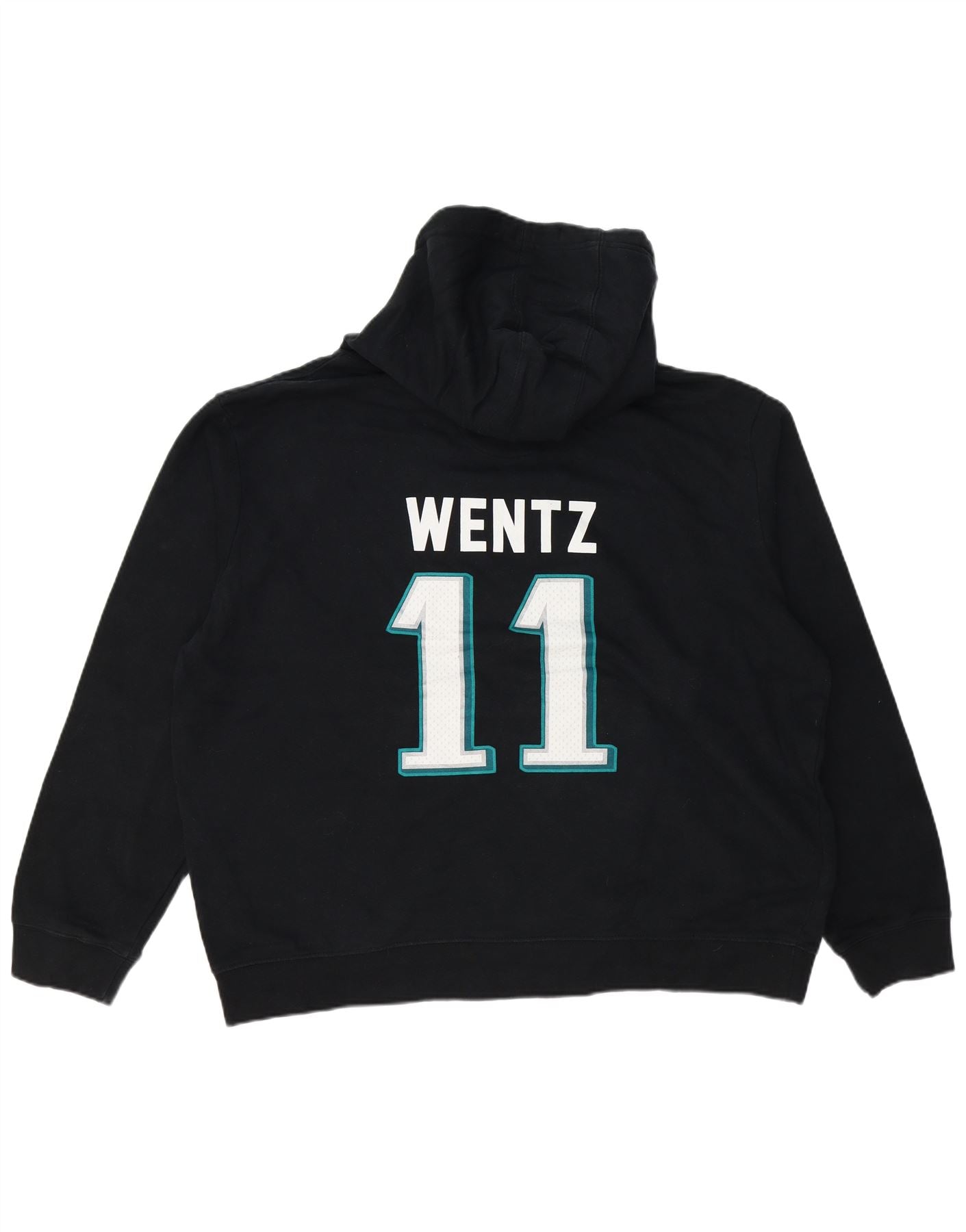 - AI Description: This NFL Team Apparel mens hoodie jumper is crafted from a soft cotton blend fabric, offering comfort and warmth. It features a classic hooded design with a pullover style. Long sleeves and a regular fit ensure ease of wear. The front proudly displays a graphic logo for the Philadelphia Eagles and player Carson Wentz. Practical pockets complete the design, making it ideal for sports fans.