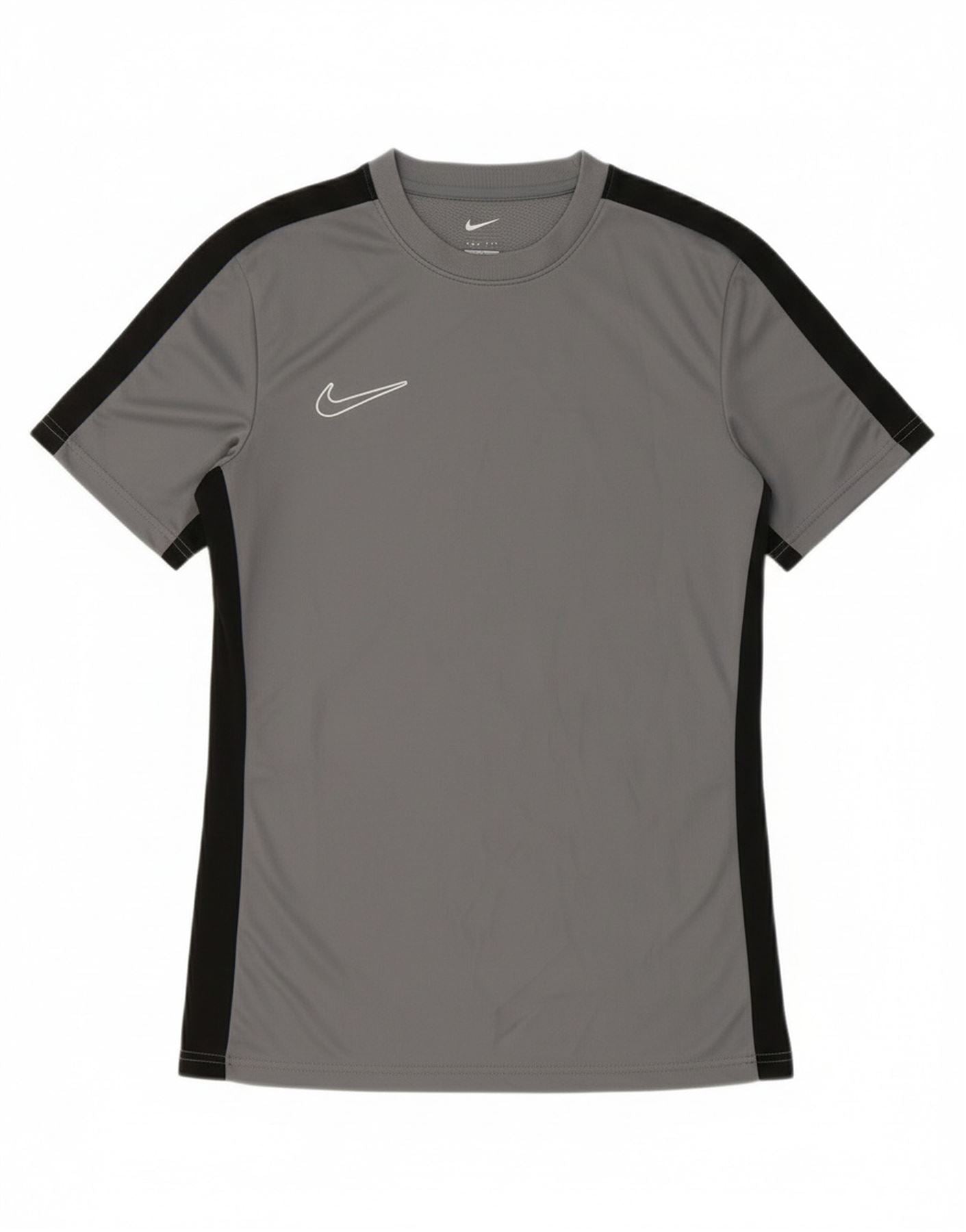 - Descrizione dell'IA: Questa maglietta da uomo Nike è realizzata in tessuto a maglia di poliestere leggero e traspirante. Presenta un classico girocollo e maniche corte. La vestibilità slim offre una silhouette atletica. I pannelli grigi del corpo principale sono completati da pannelli laterali e sulle maniche neri a contrasto. Un prominente logo Nike bianco adorna il petto. Pensato per la performance garantisce comfort durante le attività sportive come il calcio.