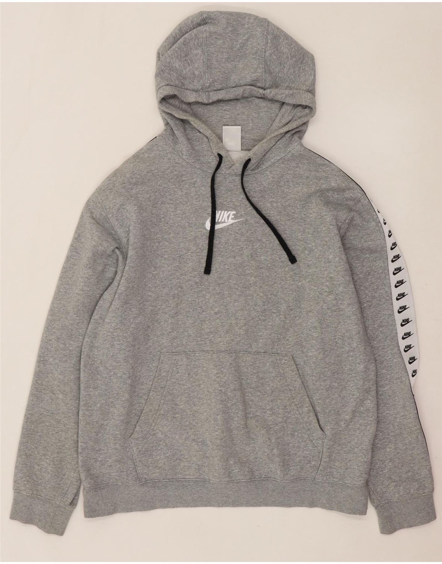 - Descrizione dell'IA: Questa felpa con cappuccio da uomo Nike è realizzata in morbido misto cotone grigio e poliestere. Presenta un design classico a pullover con una comoda vestibilità regolare. Lo scollo con cappuccio include lacci regolabili per una sensazione personalizzata. Le maniche lunghe sono rifinite con un nastro con logo ripetuto, che aggiunge un accento distintivo. Una pratica tasca a marsupio si trova sul davanti, migliorandone il fascino casual.