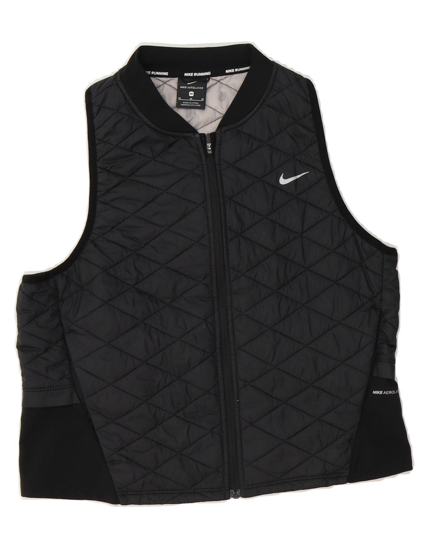 - AI Description: This pre-owned Nike women's waistcoat is in excellent condition. Crafted from a blend of polyester and elastane, this black, sleeveless sports waistcoat features a geometric pattern, round neck, and a regular fit. It boasts a zip closure, zipped pockets, padded design and reflective detailing for enhanced visibility. The logo accent adds a touch of brand recognition. Label size M. A versatile and stylish addition to your activewear collection.
