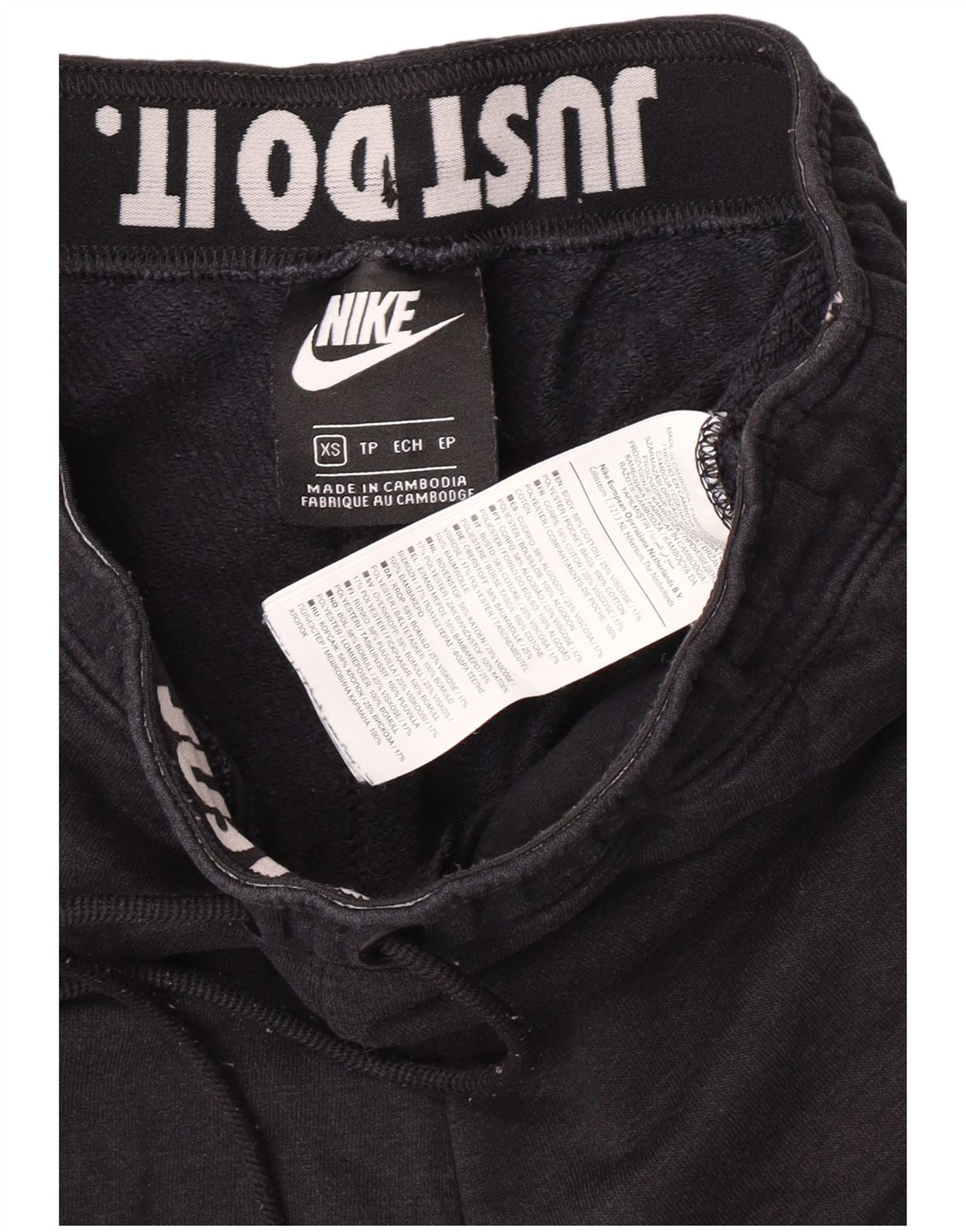 - Descrizione dell'IA: Questi joggers Nike da donna sono realizzati in un morbido tessuto a maglia misto di cotone, poliestere e viscosa. Presentano una vestibilità comoda con vita elasticizzata e coulisse per il massimo comfort. Il colore nero è accentuato da un audace logo grafico bianco sulla gamba e dallo slogan "Just Do It" sulla cintura. Le tasche aggiungono dettagli pratici a questi pantaloni in stile atletico.