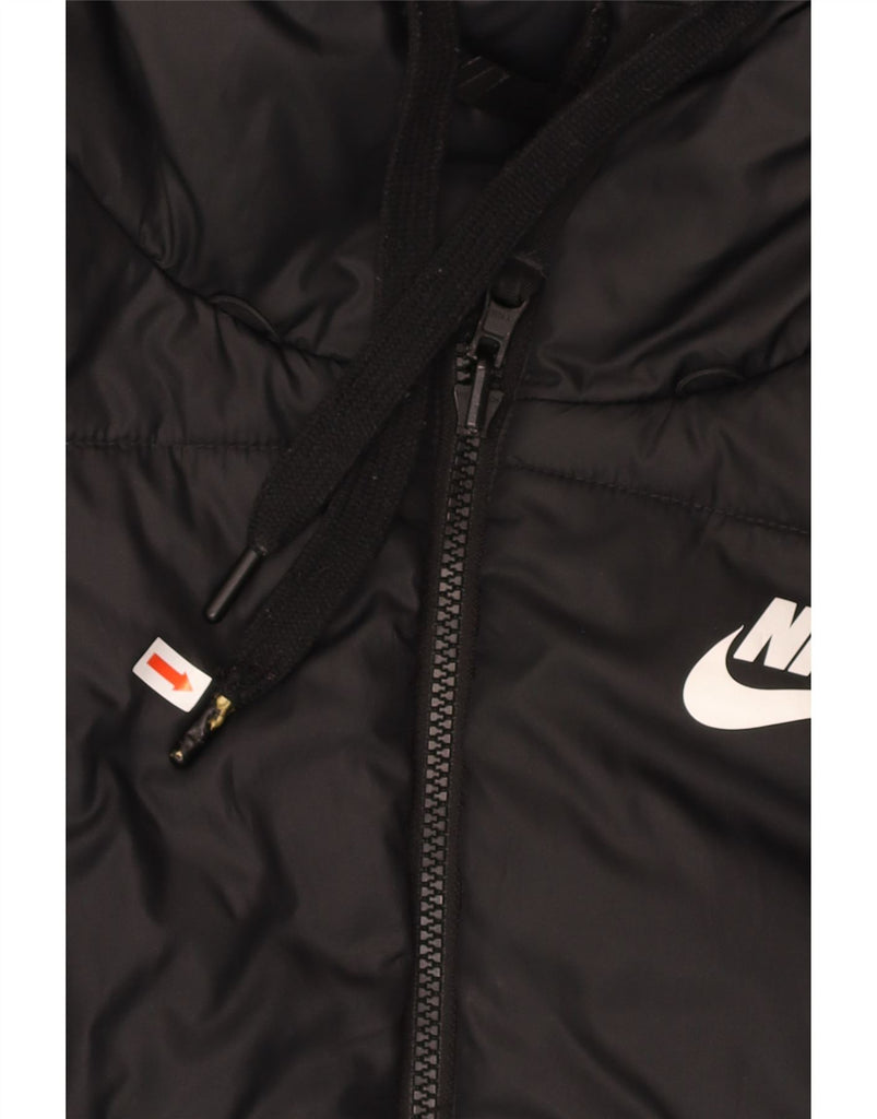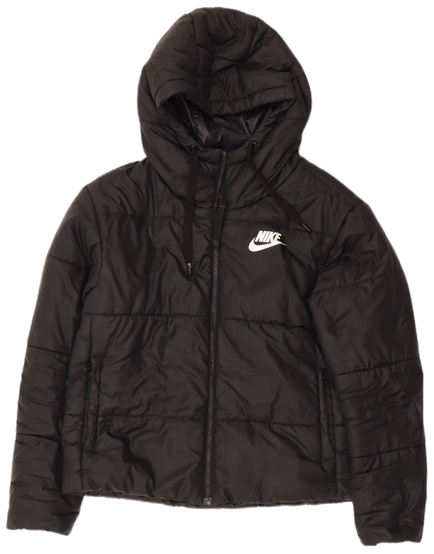 - AI Description: This Nike womens padded jacket is crafted from a lightweight woven fabric, offering a smooth, padded texture. It features a high neck and a full zip closure for warmth. The long sleeves and regular fit ensure comfortable wear. A practical hood provides extra protection. Subtle branding with a logo adds a signature athletic touch. This black jacket is ideal for sports or casual layering, combining functionality with a sleek design.