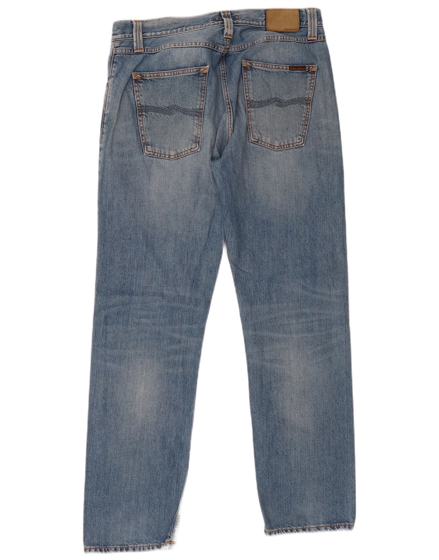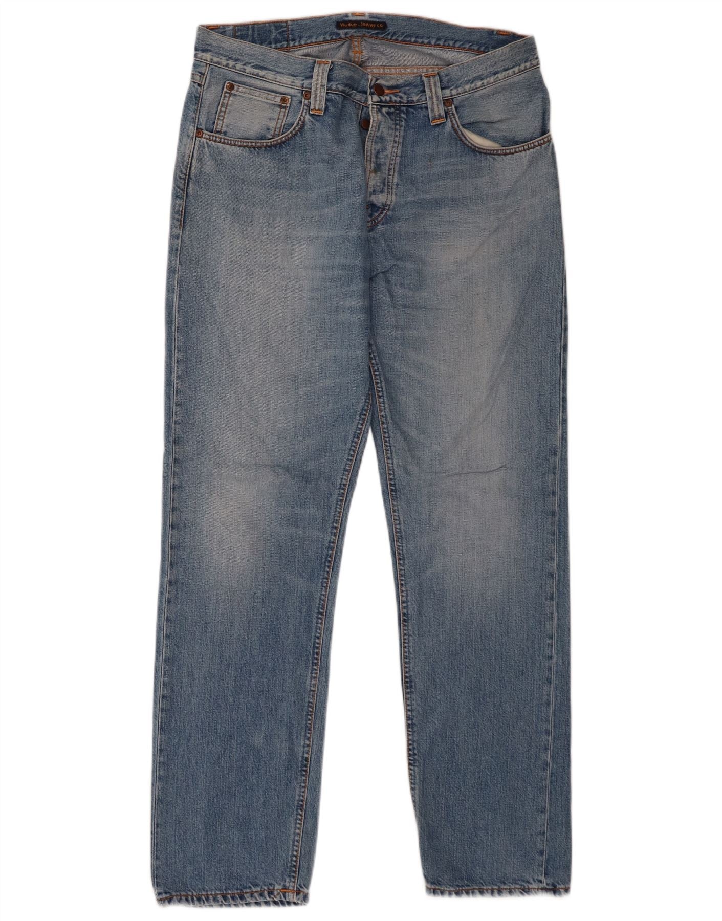 - AI Description: These Nudie Jeans mens straight jeans are crafted from classic blue denim. They feature a straight leg and a regular fit, ensuring timeless comfort. A button closure and traditional five-pocket design provide authentic detailing. The versatile blue denim offers an enduring aesthetic, perfect for everyday wear. This classic style balances structure with ease, making them a wardrobe essential.