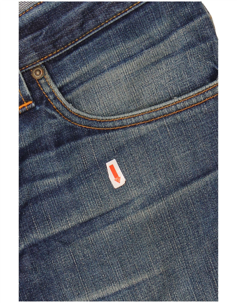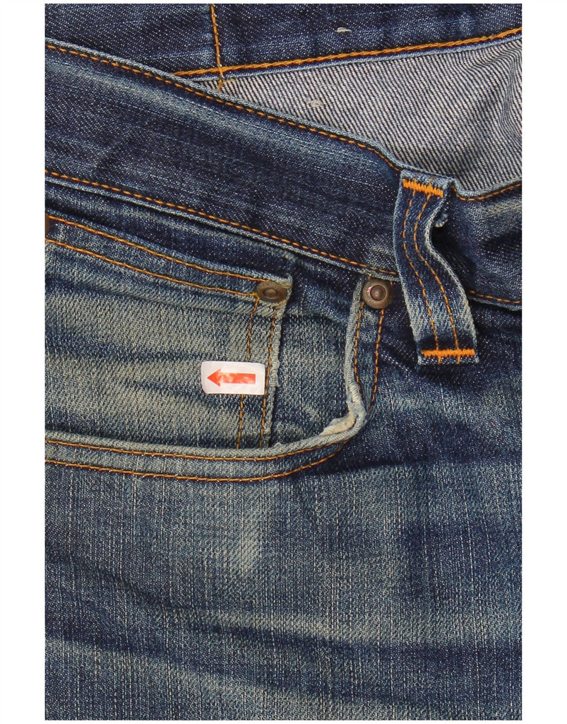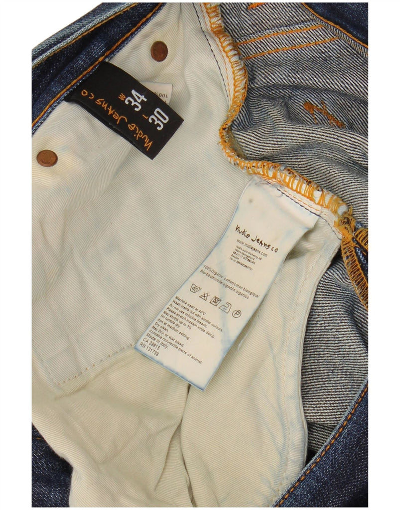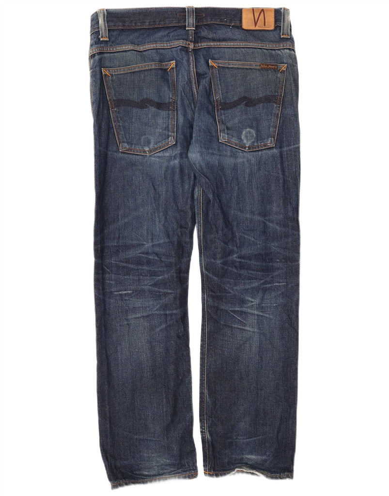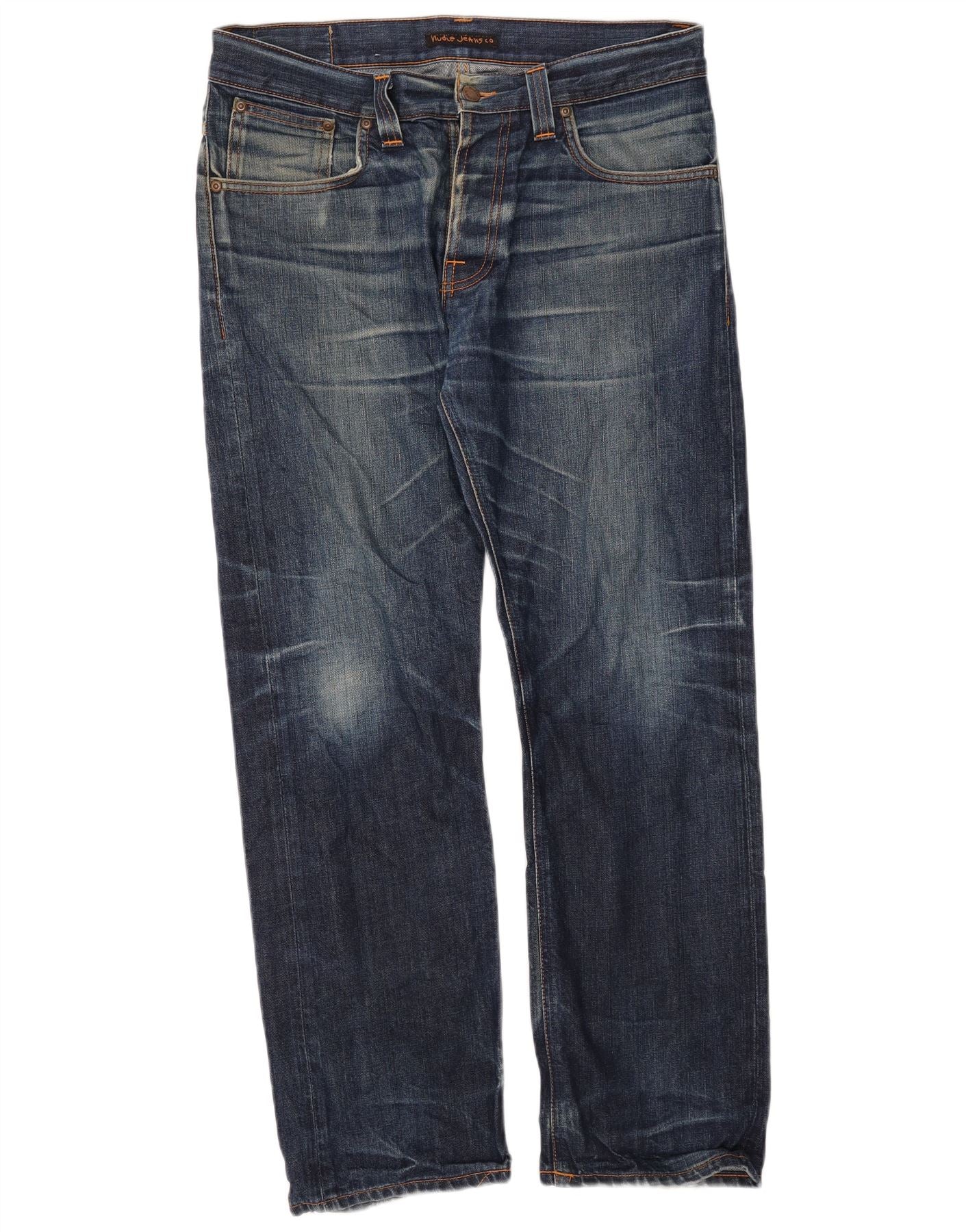 - AI Description: These Nudie Jeans mens straight jeans are crafted from 100 percent organic cotton denim. The blue fabric features a distressed finish for a lived-in aesthetic. A button closure secures the regular fit waistband. Straight legs offer a classic, comfortable silhouette. Functional pockets complete the practical design.