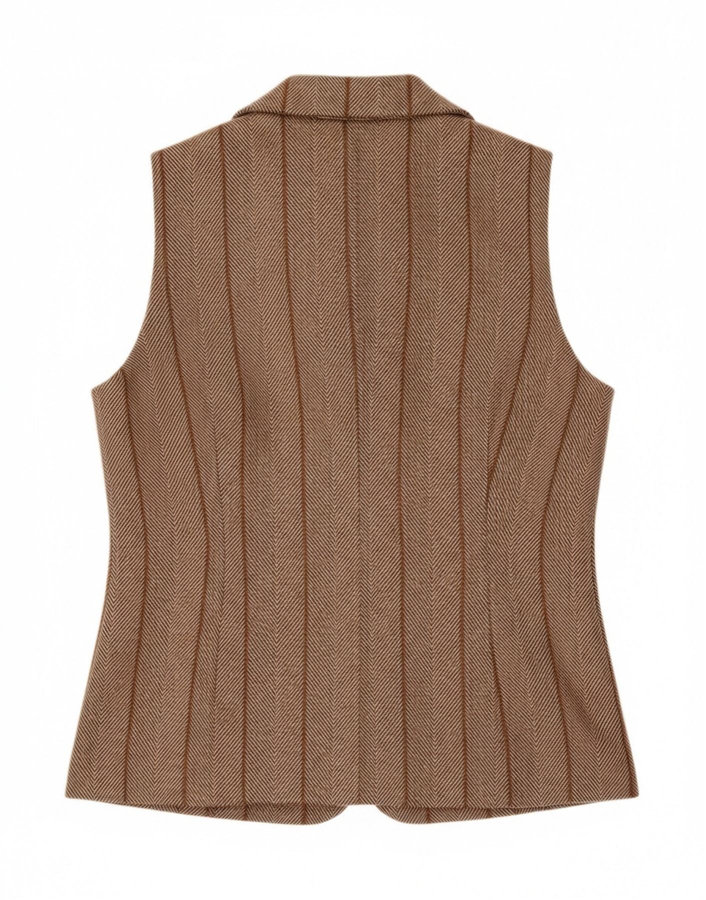 - Descrizione dell'IA: Questo gilet da donna Oliver è realizzato in tweed di lana al 100%, caratterizzato da un classico motivo a spina di pesce marrone con sottili strisce verticali. Ha uno scollo con colletto e un design senza maniche per un look raffinato. La parte anteriore si chiude con tre bottoni marroni tono su tono. Questo gilet dalla vestibilità classica è completamente foderato e offre una vestibilità regolare strutturata ma confortevole.