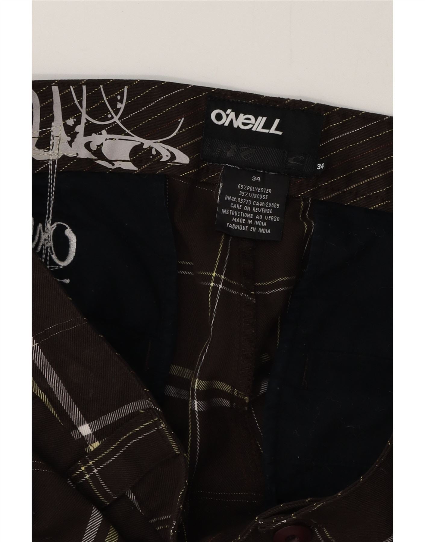 - AI Description: These O'Neal men's casual shorts are crafted from a durable polyester and viscose blend. They feature a brown base with a distinctive plaid pattern. The regular fit ensures comfort and ease of movement. A button closure secures the waist. Practical pockets add functionality. These shorts are ideal for sports or casual wear.