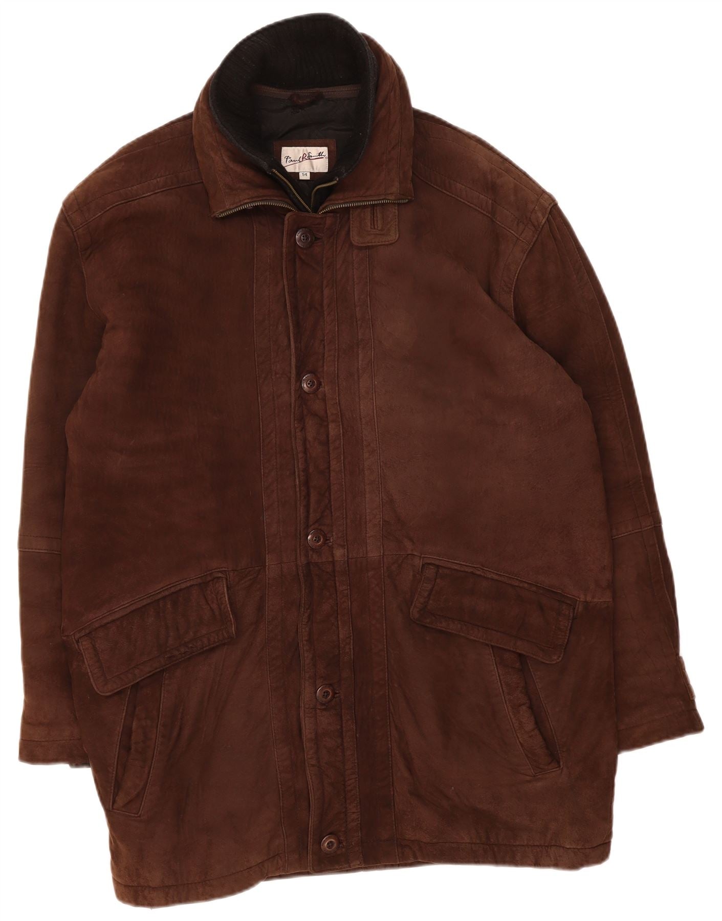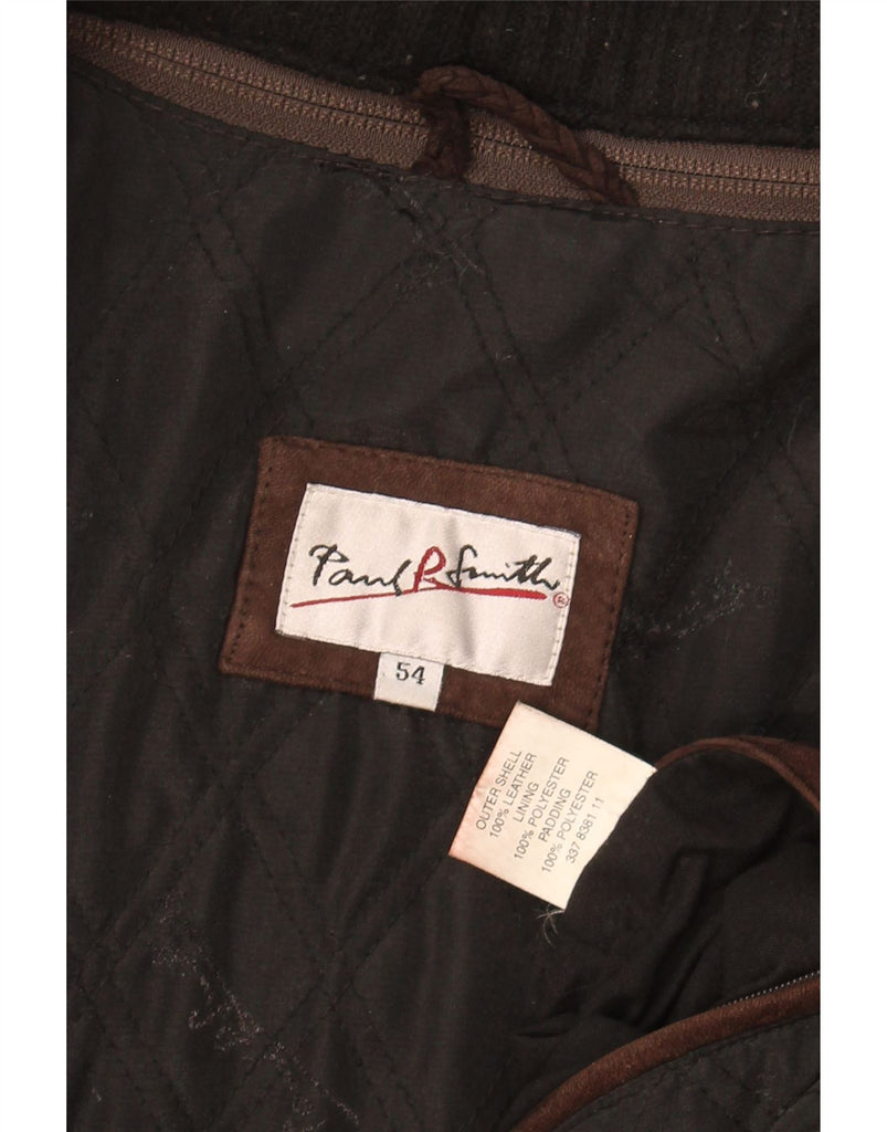 - AI Description: This Paul Smith mens Leather Jacket is crafted from rich brown leather, offering a luxurious texture. It features a classic collared neckline and a button-up front for a refined look. Long sleeves and a regular fit ensure comfortable wear. The jacket is padded and fully lined for warmth and structure. Practical pockets add functional detail. This timeless piece combines classic style with premium material.