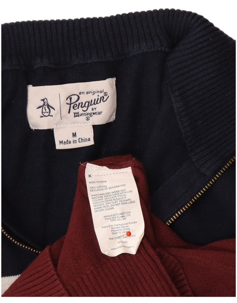 PENGUIN Mens Zip Neck Jumper Sweater Medium Burgundy Colourblock Cotton