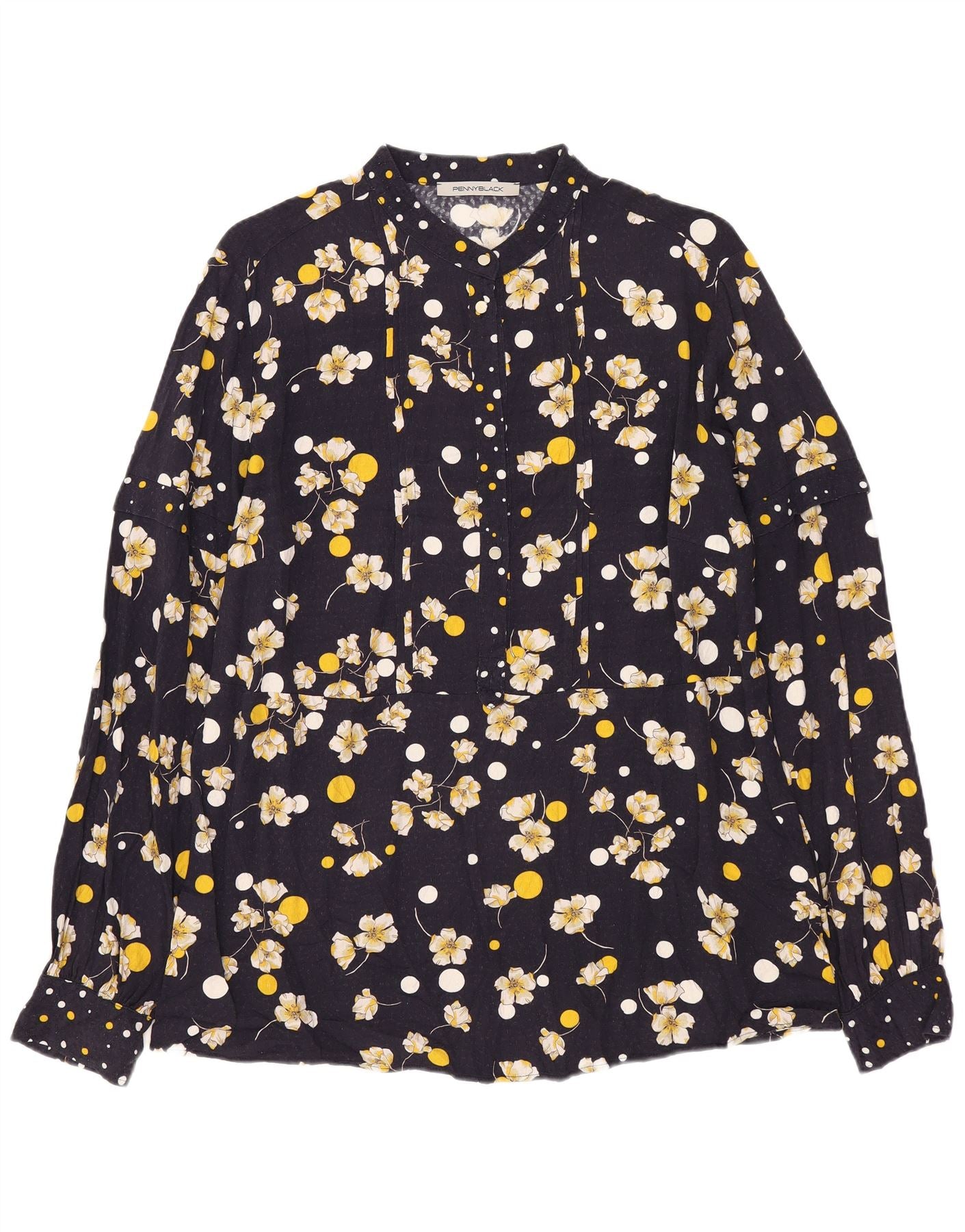 - Descrizione dell'IA: Questa camicetta camicia da donna Penny Black è realizzata in morbido rayon di viscosa. Presenta un sorprendente motivo floreale in bianco e giallo su uno sfondo blu navy. Lo scollo con colletto e la chiusura con bottoni offrono un look classico. Le maniche lunghe con polsini abbottonati completano il design. Ha una vestibilità regolare per un abbigliamento comodo.