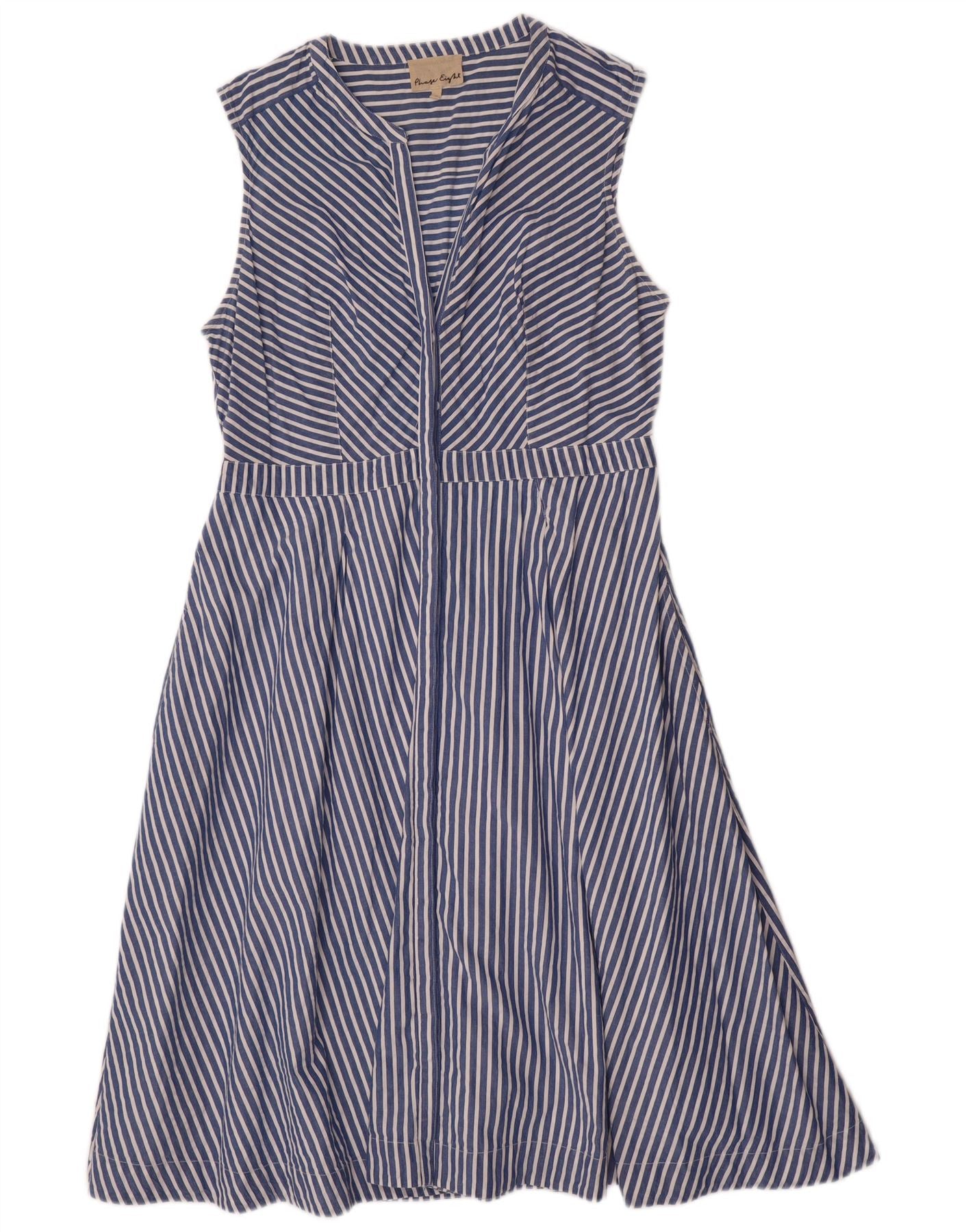 - AI Description: This Phase Eight womens A-line dress is crafted from pure cotton woven fabric. It features a classic striped pattern in blue. The sleeveless design and V-neckline offer a clean, elegant silhouette. A full zip closure ensures a smooth fit. Its A-line cut flows gracefully, providing a regular, comfortable fit. This classic style is perfect for warm weather.