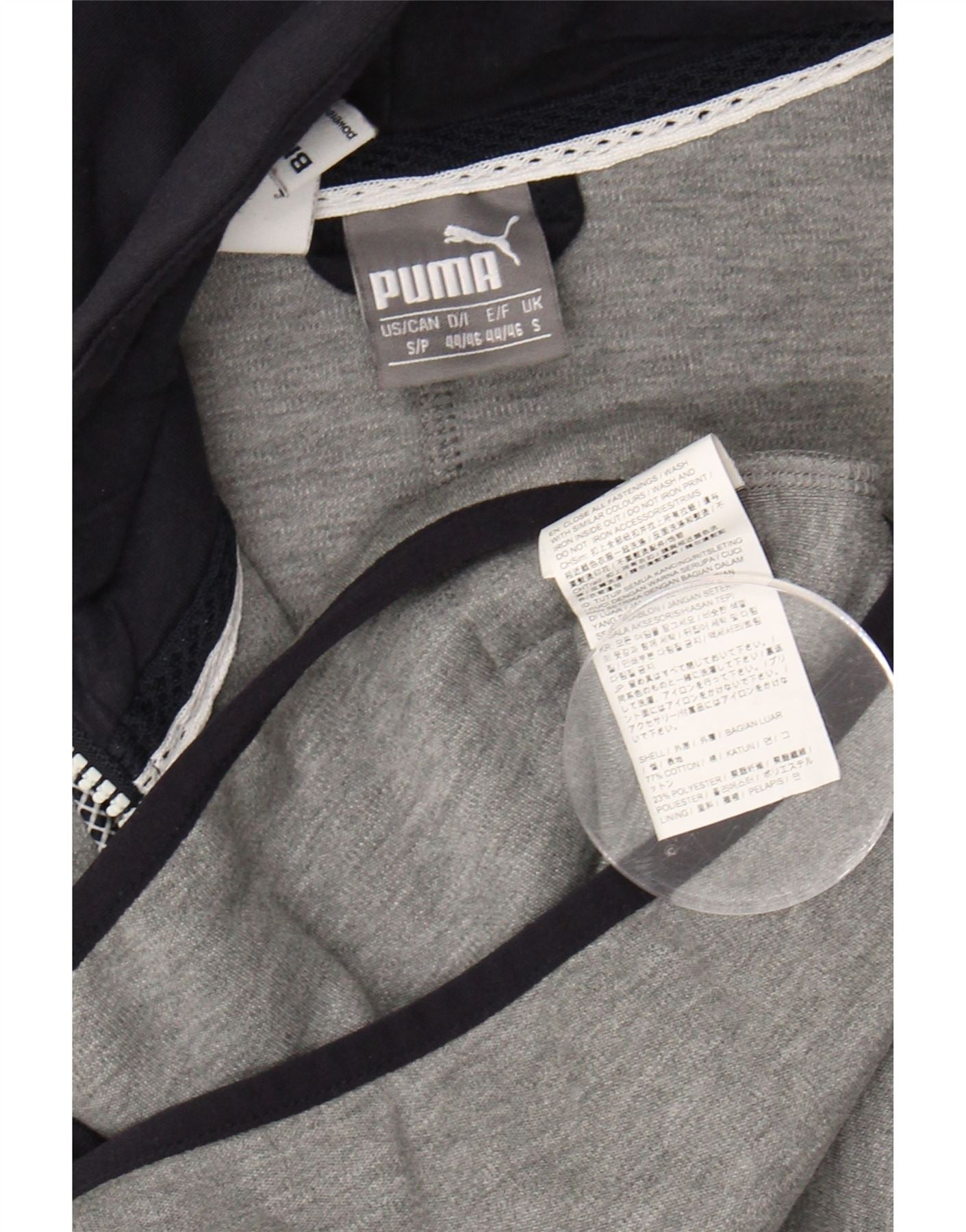 - AI Description: This pre-owned Puma hoodie is a versatile addition to your sportswear collection. Crafted from a soft cotton-blend fleece (77% Cotton with Polyester), it features a full zip closure, zipped pockets, and a comfortable regular fit. The hooded design incorporates a graphic element and subtle logo accent. Condition: Fair, with minor stains on the sleeve and back near the BMW Motorsport detail. Size S/P.