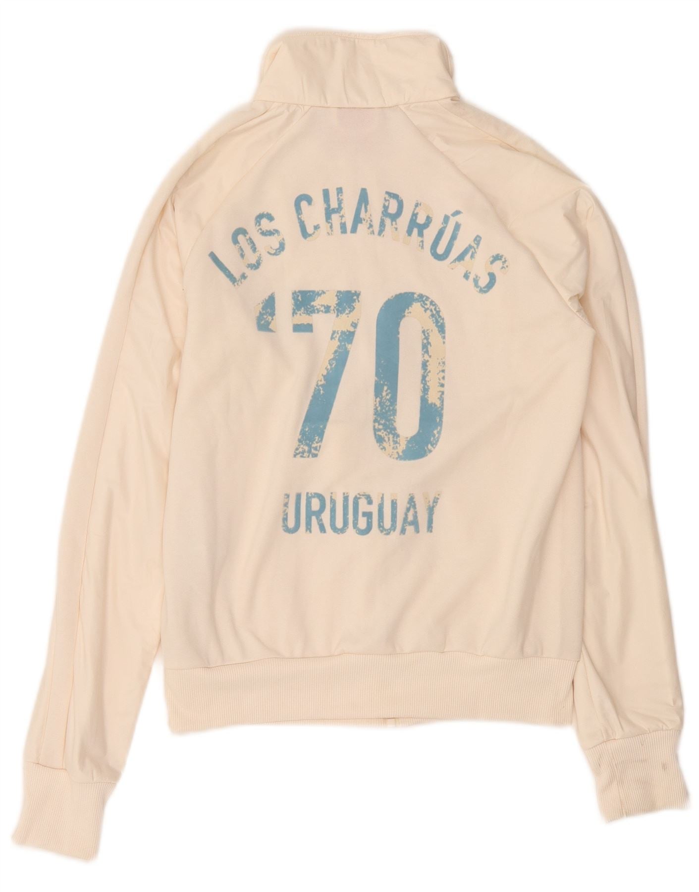 - Descrizione dell'IA: Questa giacca superiore della tuta da donna Puma è realizzata in un misto poliestere liscio bianco sporco. Presenta un collo alto e una chiusura full zip per un abbigliamento versatile. Le maniche lunghe terminano con comodi polsini con risvolto. La vestibilità regolare offre facilità di movimento. Un sottile logo Puma adorna la parte anteriore. La parte posteriore sfoggia la grafica distintiva dei Los Charruas 70 Uruguay, aggiungendo un tocco ispirato al calcio retrò.