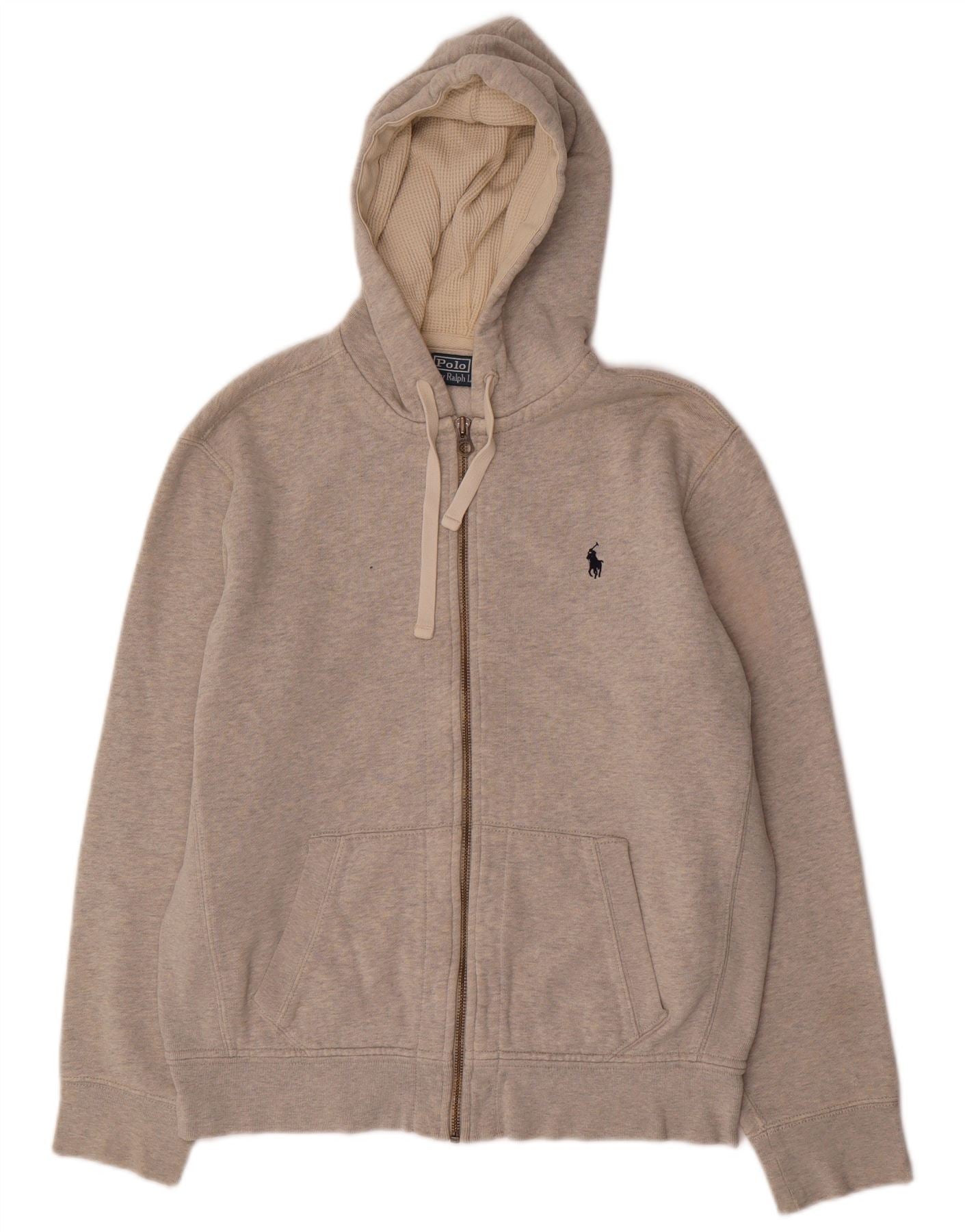 - AI Description: This Ralph Lauren men's Zip Hoodie Sweater is crafted from a soft beige cotton blend. It features a full zip closure and a comfortable hooded design. Long sleeves and a regular fit ensure classic wearability. The ribbed cuffs and hem provide a neat finish. Practical pockets add functionality. An embroidered logo offers a subtle, signature detail.