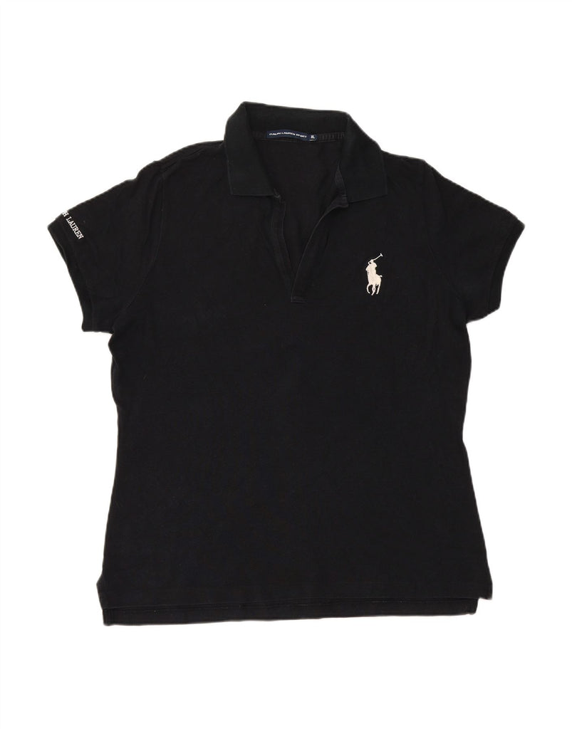 - AI Description: This Ralph Lauren womens shirt is crafted from a black knit fabric. It offers a comfortable regular fit with a touch of stretch. The collared neckline and short sleeves provide a smart yet casual silhouette. It features a button closure down the front. Subtle embroidered accenting adds a refined detail. Practical pockets enhance its functional design. This piece is perfect for versatile styling.