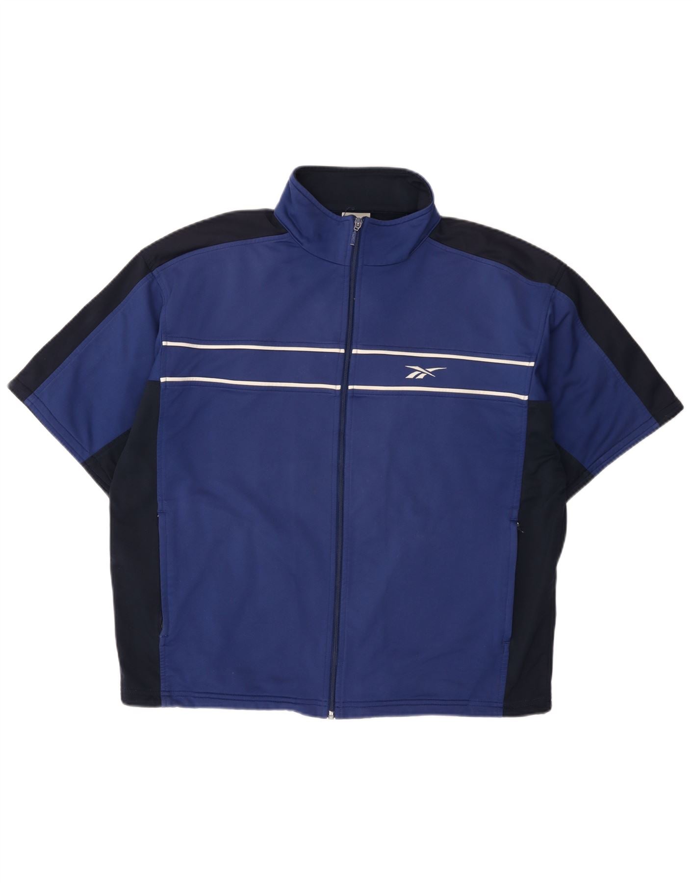 - Descrizione dell'IA: Questa giacca da tuta completa da uomo Reebok è realizzata in leggero tessuto a maglia di poliestere blu. Presenta uno scollo con colletto e una chiusura full zip. Le maniche corte offrono una vestibilità rilassata. Il design include audaci strisce bianche sul petto e un accento con il logo Reebok. I pannelli blu navy forniscono un contrasto sorprendente. Questa giacca dalla vestibilità regolare è perfetta per l'abbigliamento sportivo o casual, offrendo comfort e stile.