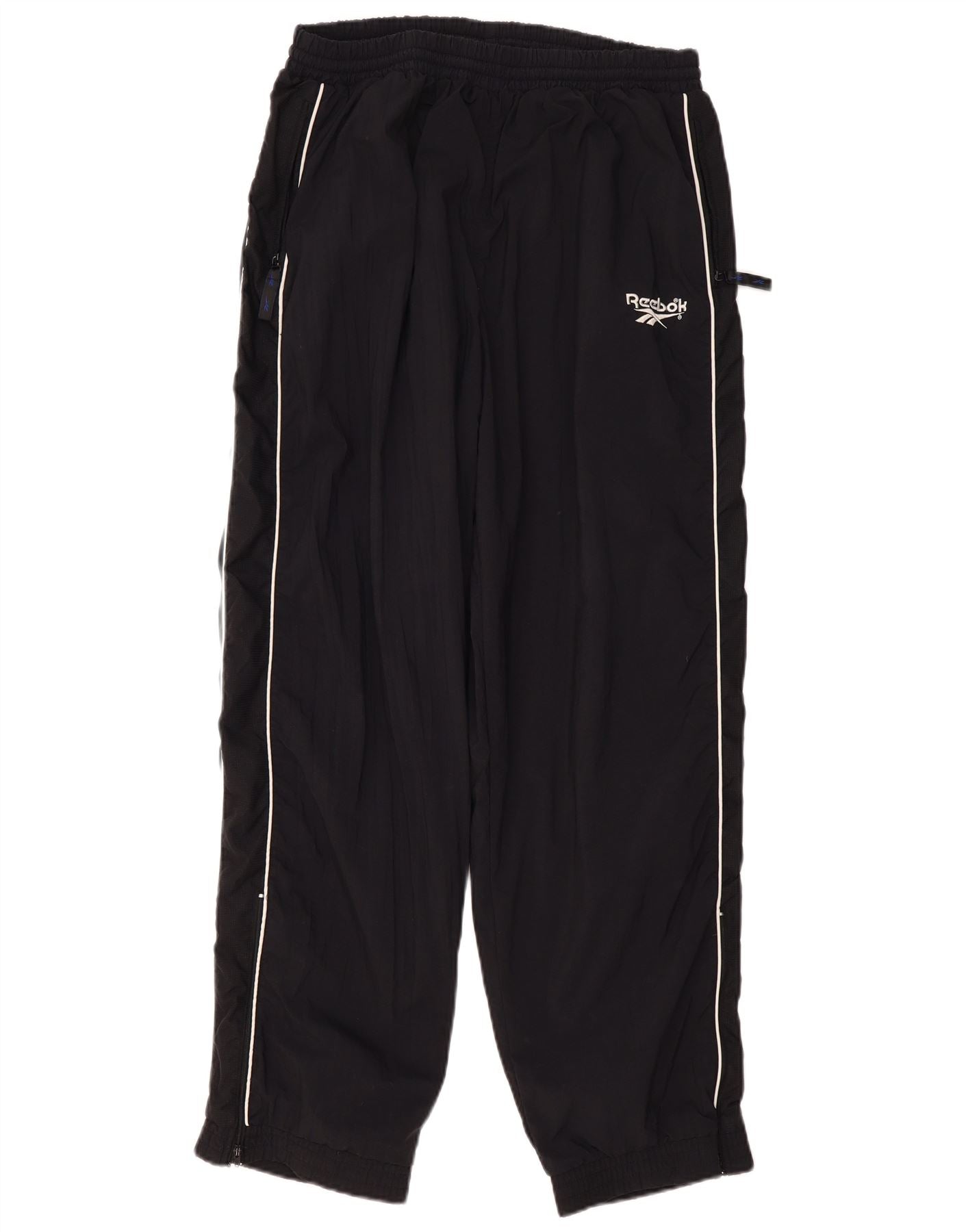 - Descrizione dell'IA: Questi pantaloni antivento da uomo Reebok sono realizzati in poliammide nera, che offre una trama intrecciata leggera. Sono dotati di un comodo elastico in vita per una facile vestibilità. Il taglio rilassato alla lunghezza capri include pratiche tasche con cerniera e cerniere alla caviglia per la versatilità. Le strisce laterali bianche aggiungono un classico dettaglio atletico, completato dal logo Reebok.