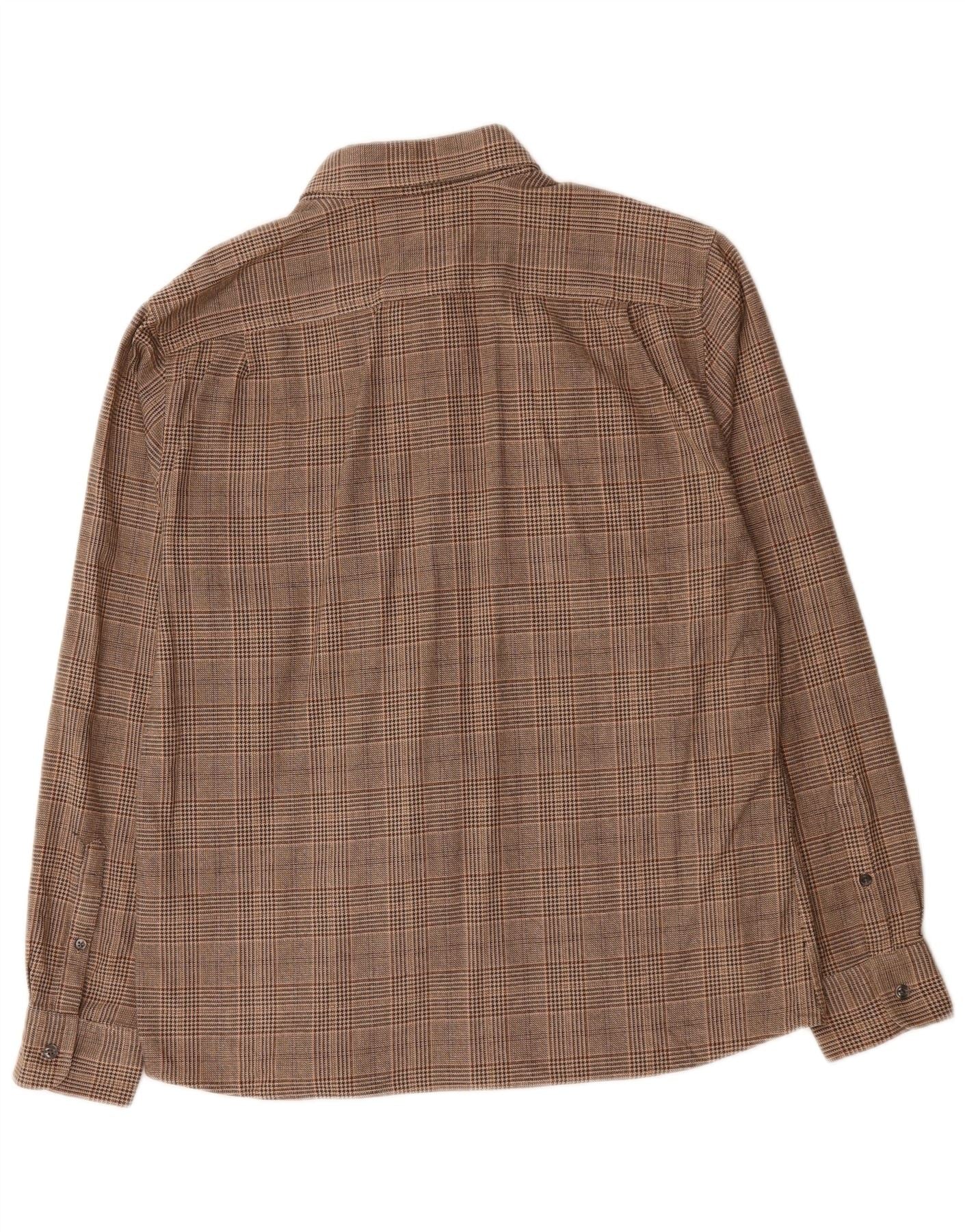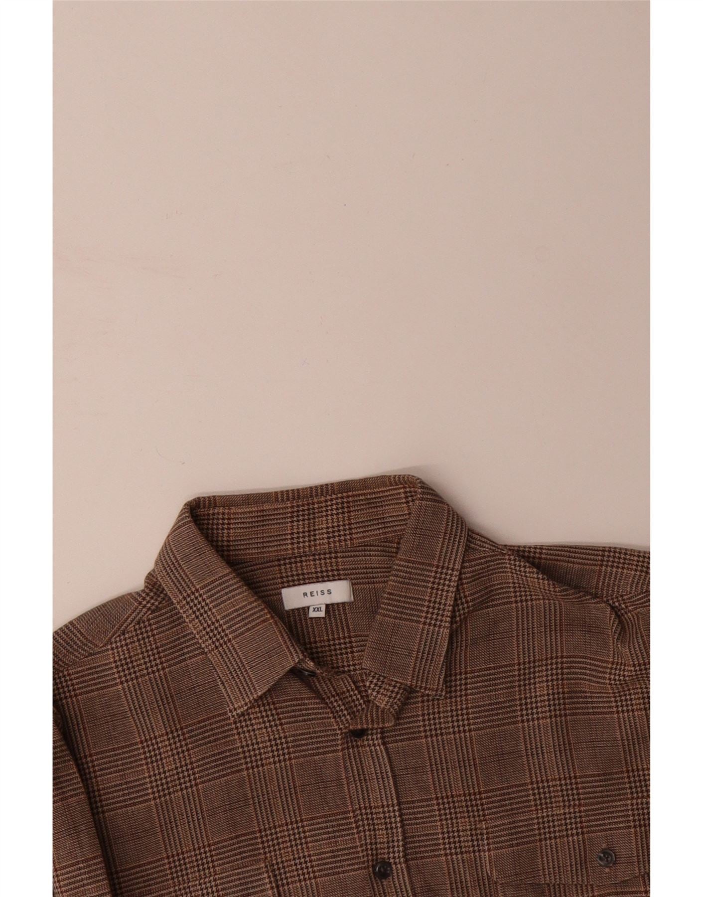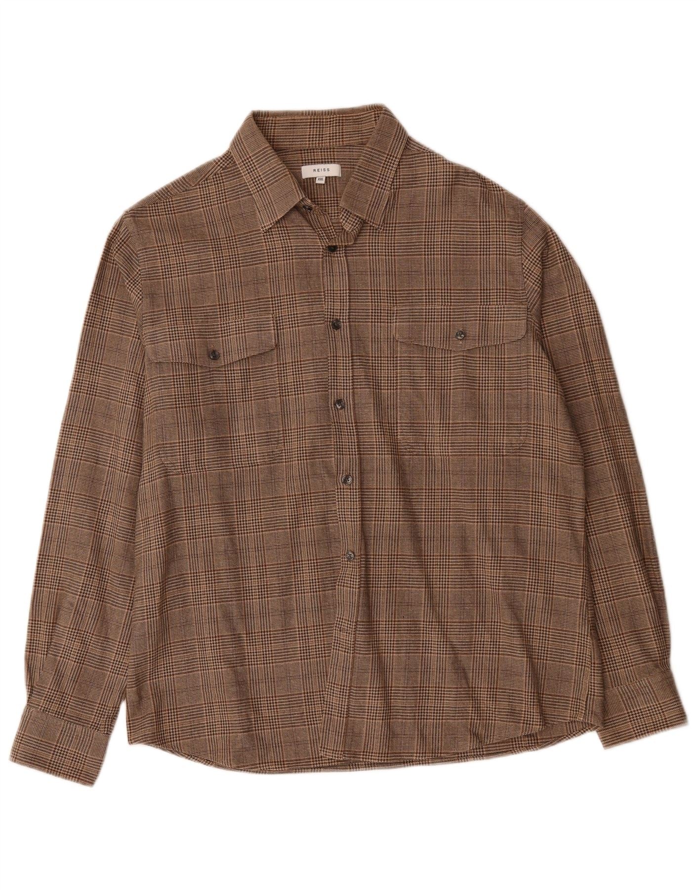 - AI Description: This Reiss mens Flannel Shirt is crafted from a soft, woven flannel fabric. It features a classic brown plaid pattern for a timeless aesthetic. The traditional collared neckline and full button-up front enhance its smart-casual appeal. Long sleeves with buttoned cuffs complete the design. A regular fit ensures comfortable wear, while practical chest pockets add functional detail.