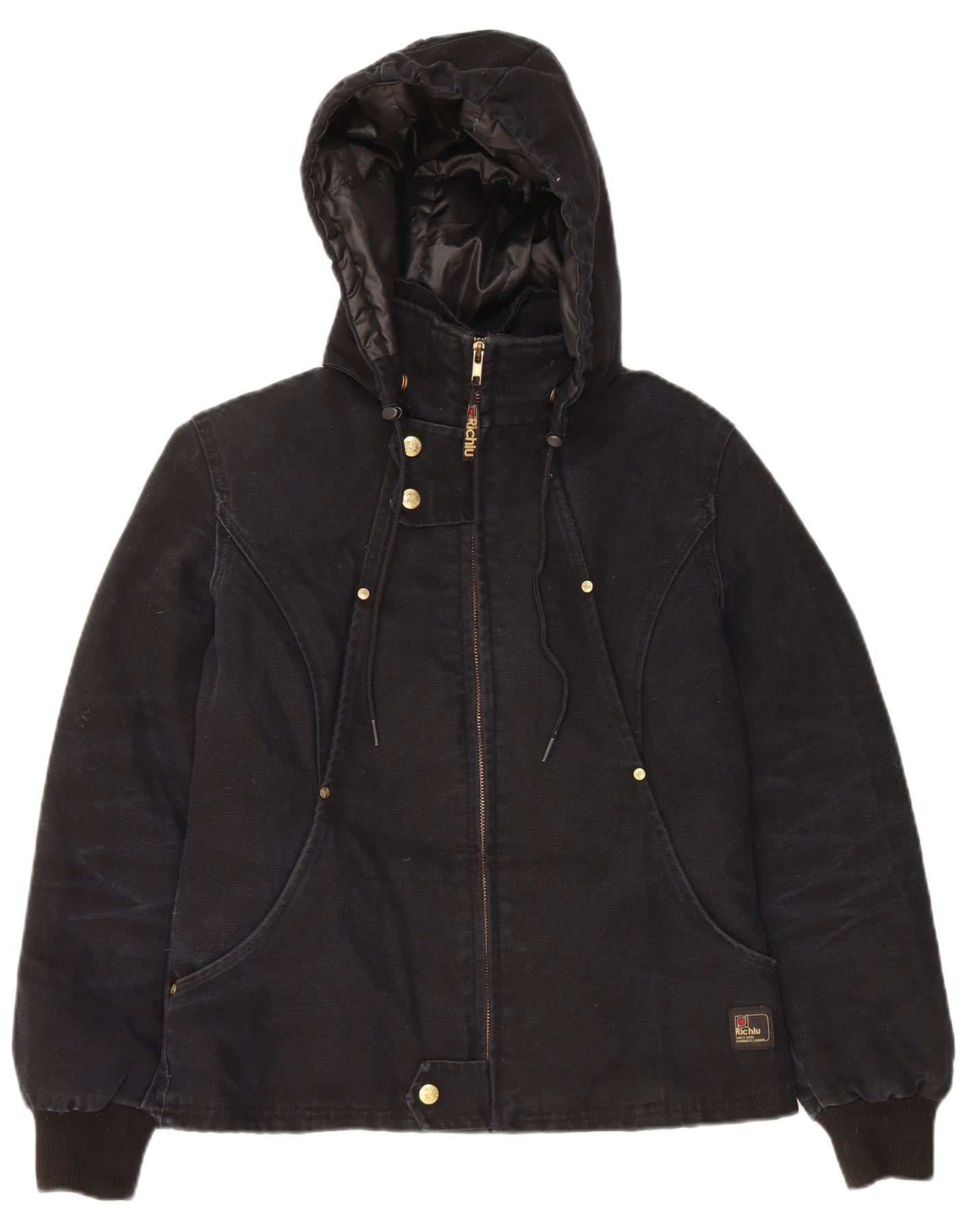 - Descrizione dell'IA: Questa giacca anorak da donna Richlu è realizzata in resistente tela nera, offrendo una sensazione robusta ma confortevole. Presenta un design imbottito per il calore. La vestibilità regolare garantisce facilità di movimento. Ha il collo alto e le maniche lunghe con polsini risvoltati. Una chiusura con zip completa protegge la parte anteriore. La giacca include un pratico cappuccio e tasche funzionali. Un sottile accento sul logo aggiunge un tocco distintivo.